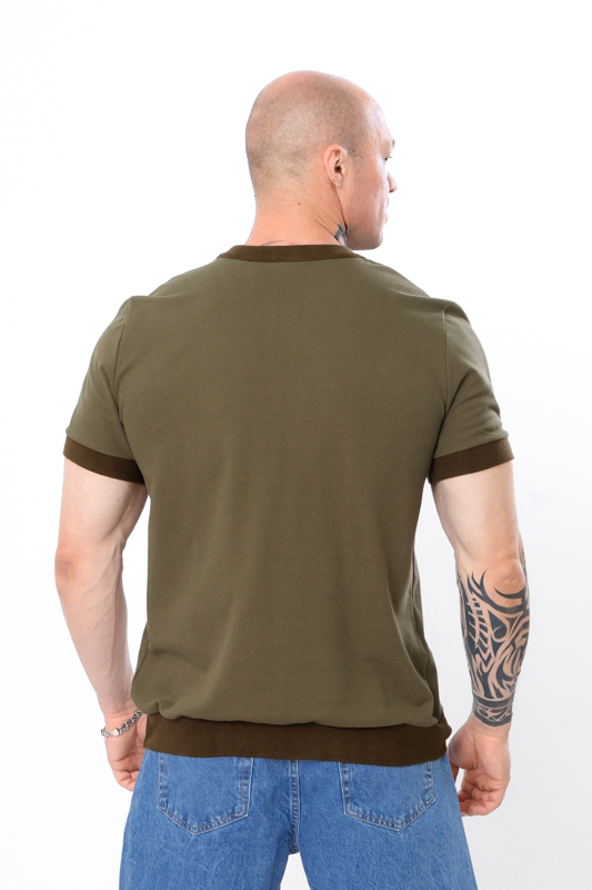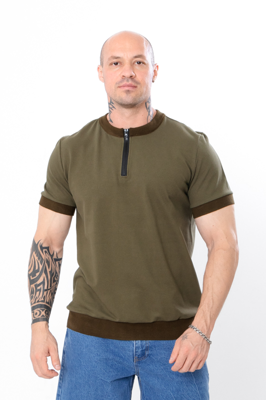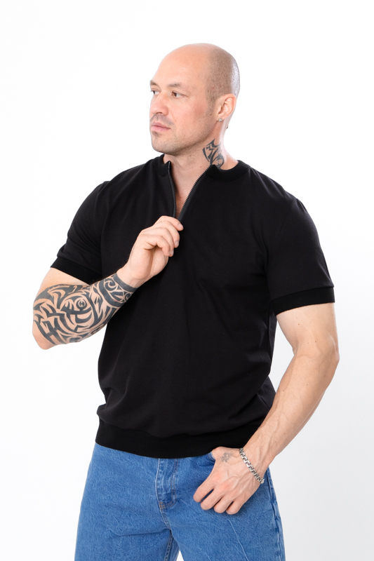 Базова чоловіча футболка, пошита з однотонного полотна – лакоста. Дане полотно міцне та здатне зберігати форму. Футболка з короткими рукавами, має округлу горловину та невелику блискавку спереду. На рукавах та по низу футболки є еластичніі манжети. Футболка чудово поєднується з джинсами або бриджами.