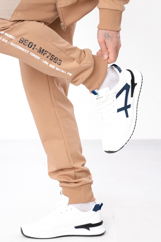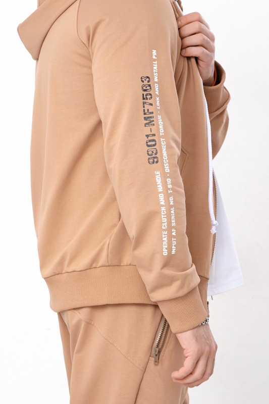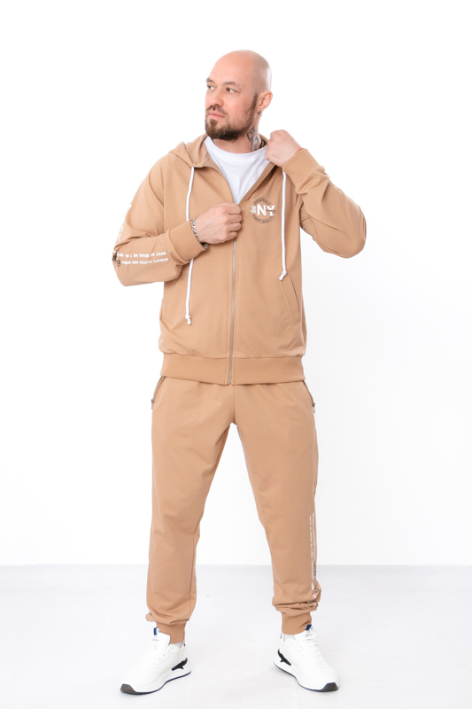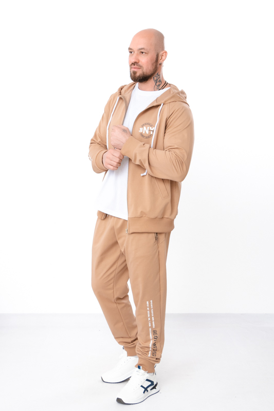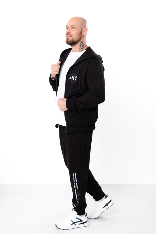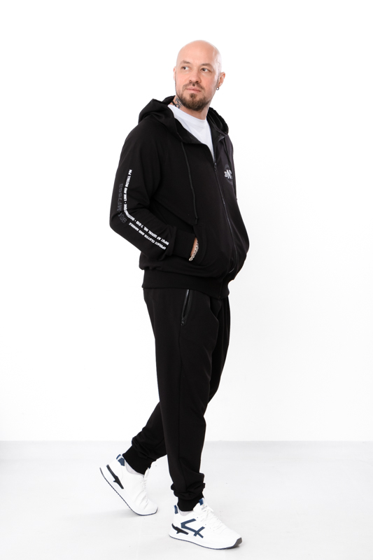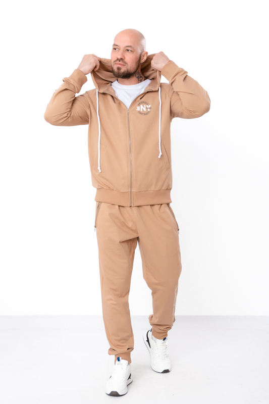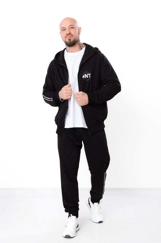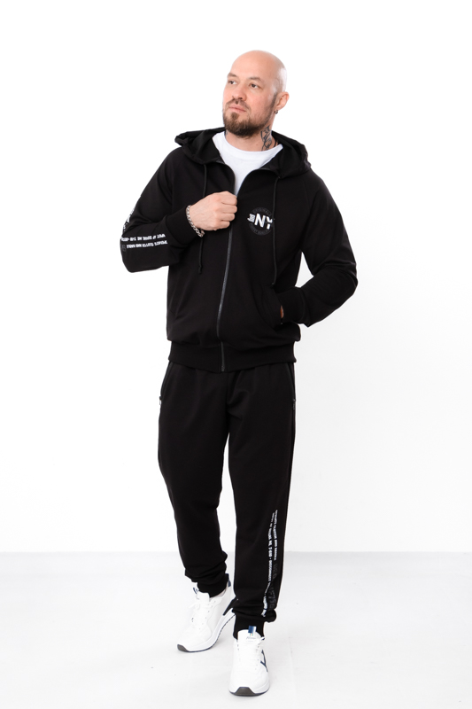 Верх костюма представлений у вигляді зручної кофти на блискавці з капюшоном, яка додає образу спортивного характеру та функціональності. Вона легко одягається, добре сідає по фігурі та не обмежує рухів, що особливо важливо для активного ритму життя. Капюшон додає практичності, захищаючи від прохолоди та вітру, а також створює завершений вигляд у стилі casual. Лаконічний дизайн робить кофту універсальною, дозволяючи поєднувати її з іншими елементами гардероба.