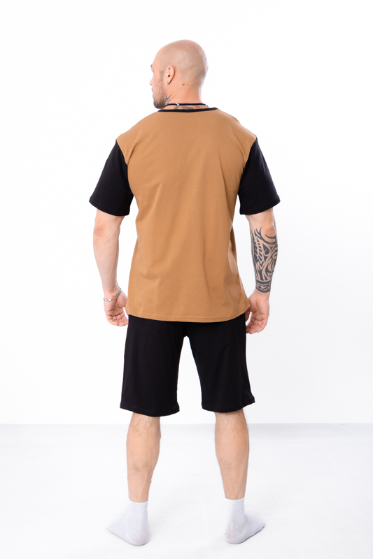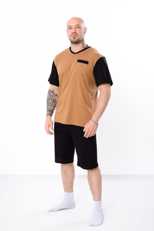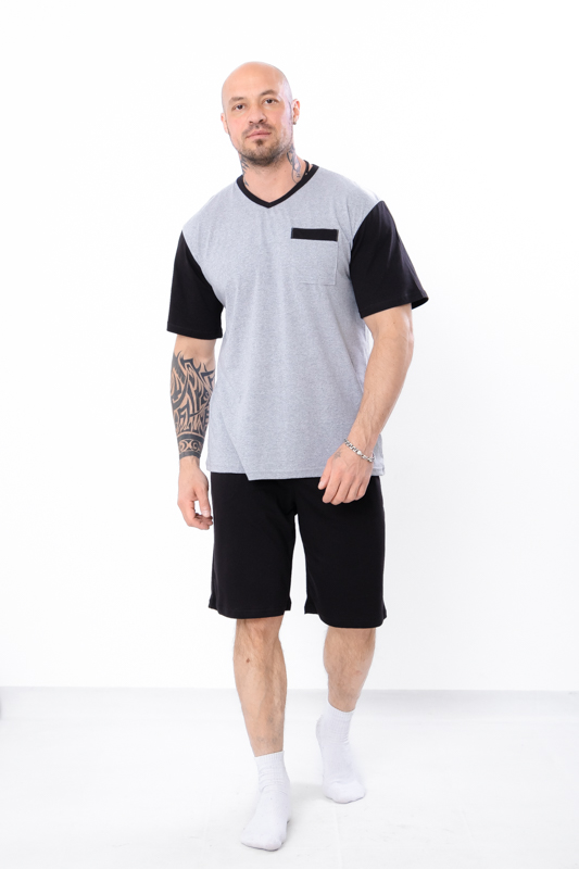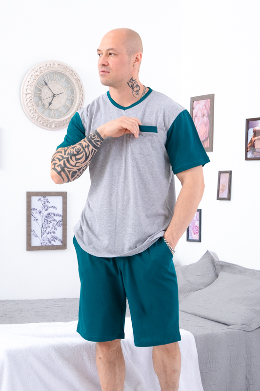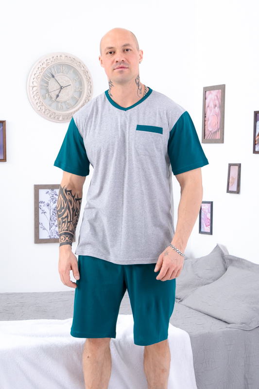 Піжама для чоловіків з однотонного куліру. Модель складається з футболки та шортів. Футболка з округлою горловиною, короткими рукавами, спереду є кишеня. Шорти прямі на широкій гумці, вільного крою. Модель підійде як для сну, так і в якості домашнього одягу. Полотно натуральне, тому при пранні може давати невелику усадку.