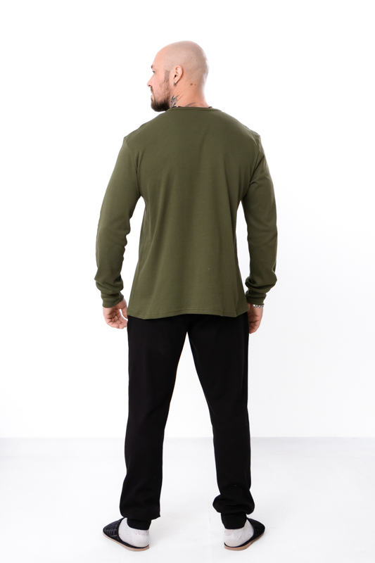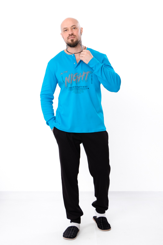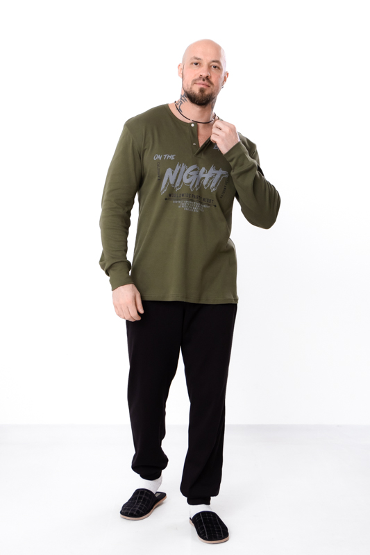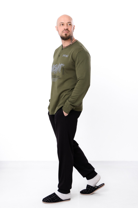 Верх піжами виконаний у вигляді лонгсліва з довгим рукавом, який забезпечує затишок і тепло, не створюючи відчуття важкості. Крій продуманий таким чином, щоб не обмежувати рухів, дозволяючи вільно змінювати положення під час сну або відпочинку. Завдяки цьому модель підходить як для нічного часу, так і для домашнього використання протягом дня. Лаконічний дизайн із мінімалістичними елементами додає виробу сучасного вигляду, підкреслюючи стриманий чоловічий стиль.