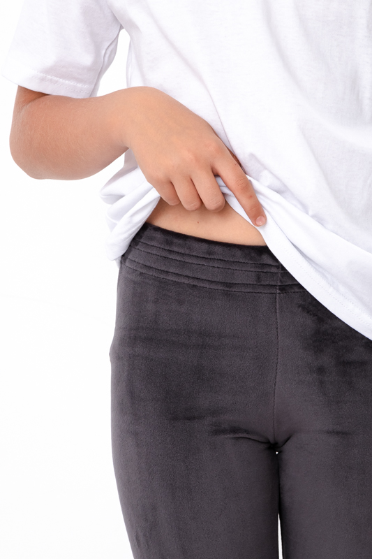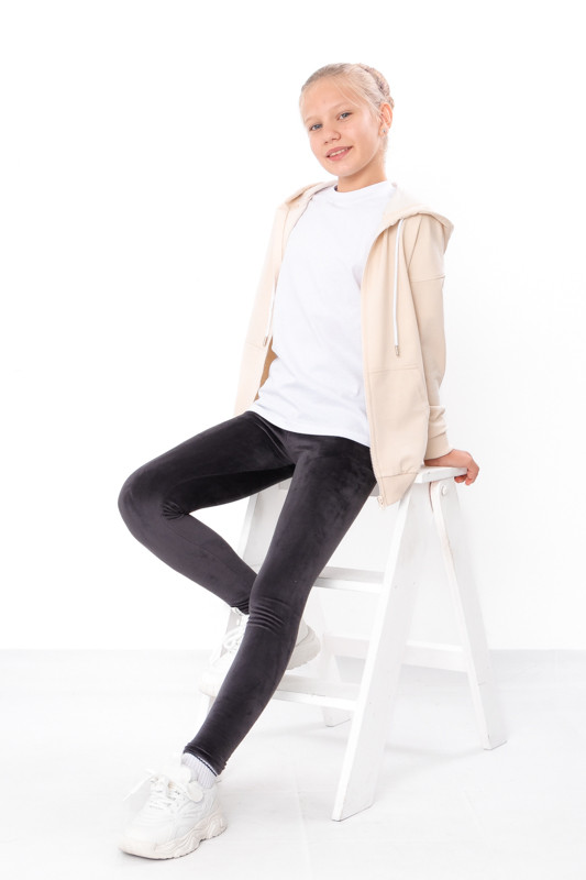 Велюр має легкий оксамитовий ефект, завдяки чому лосини виглядають елегантно та святково навіть у звичайному повсякденному образі. Вони чудово поєднуються з туніками, светрами, худі або жилетами. М’яка еластична талія забезпечує комфортну посадку, не тисне на живіт і дозволяє дитині вільно рухатись, грати чи бігати.