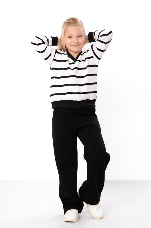 Штани палаццо для дівчинки з полотна трьохнитка – це сучасний вибір для тих, хто цінує комфорт і стиль. Вільний фасон із широкими штанинами створює ефект легкості та додає образу витонченості, дозволяючи дитині почуватися вільно та впевнено у будь-якій ситуації.