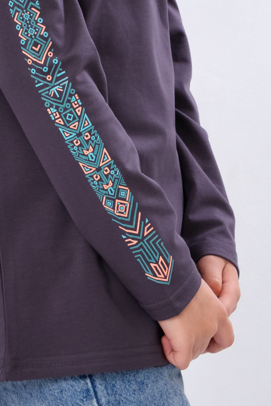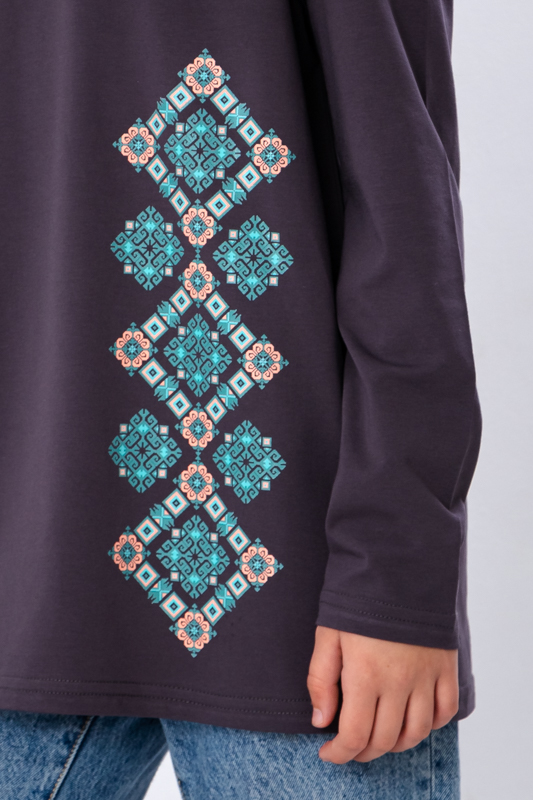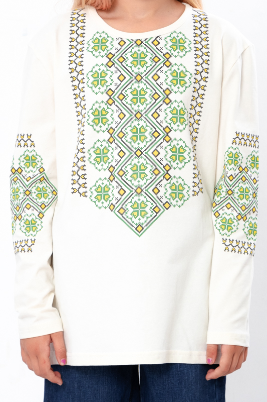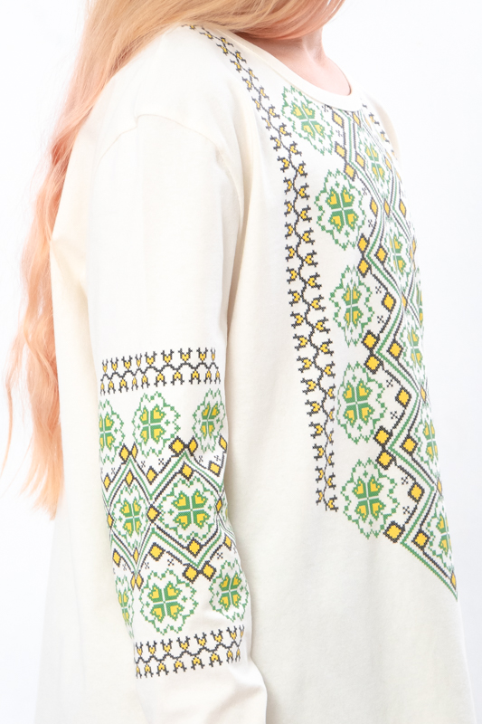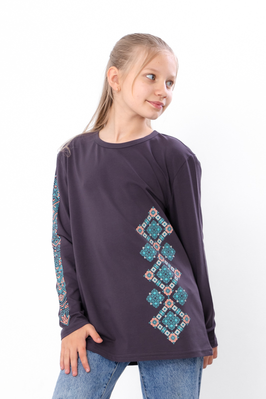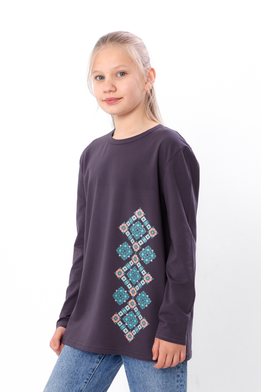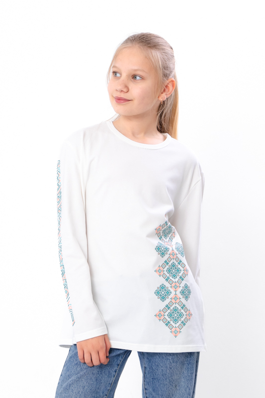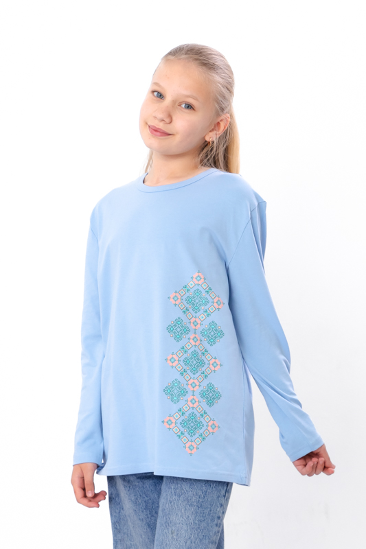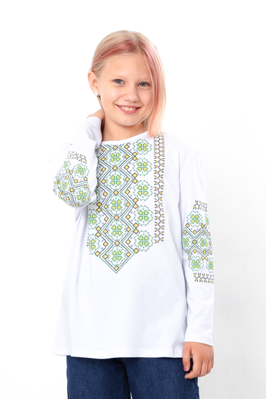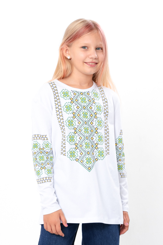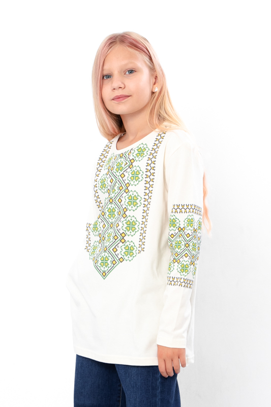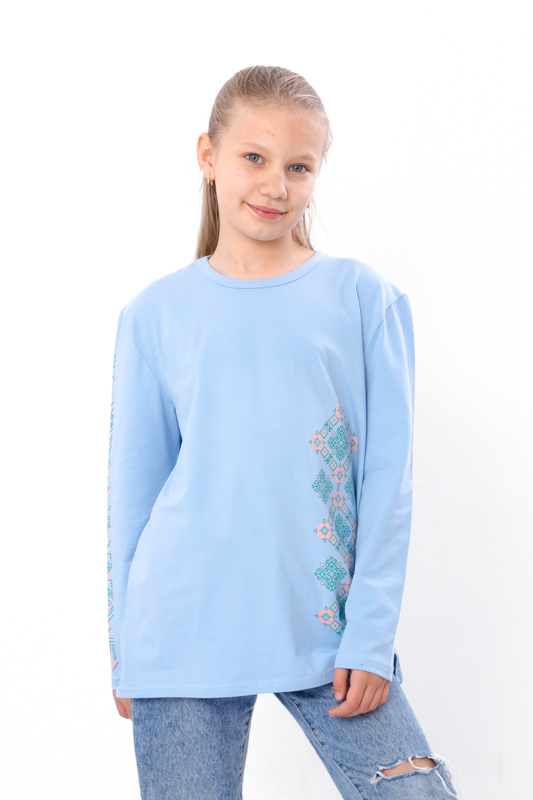 Джемпер для дівчинки пошитий з еластичного трикотажного полотна - фулікра. Полотно гарної якості, при правильному догляді не дає усадку, не линяє та не скочується . Джемпер має округлу горловину. Рукава та перед прикрашені гарним патріотичним принтом у вигляді вишивки. Джемпер чудово підійде для святкових заходів або для повсякденного носіння, можна поєднувати з джинсами або брюками.