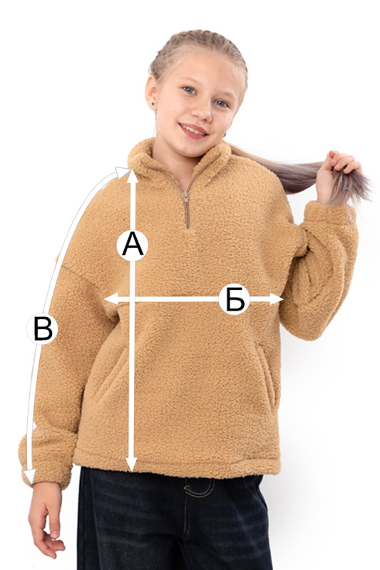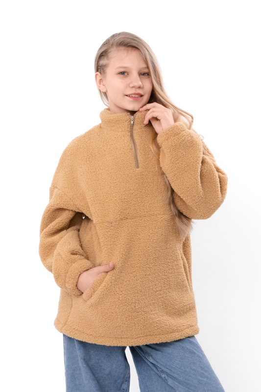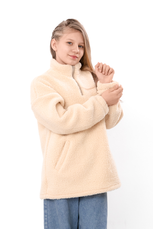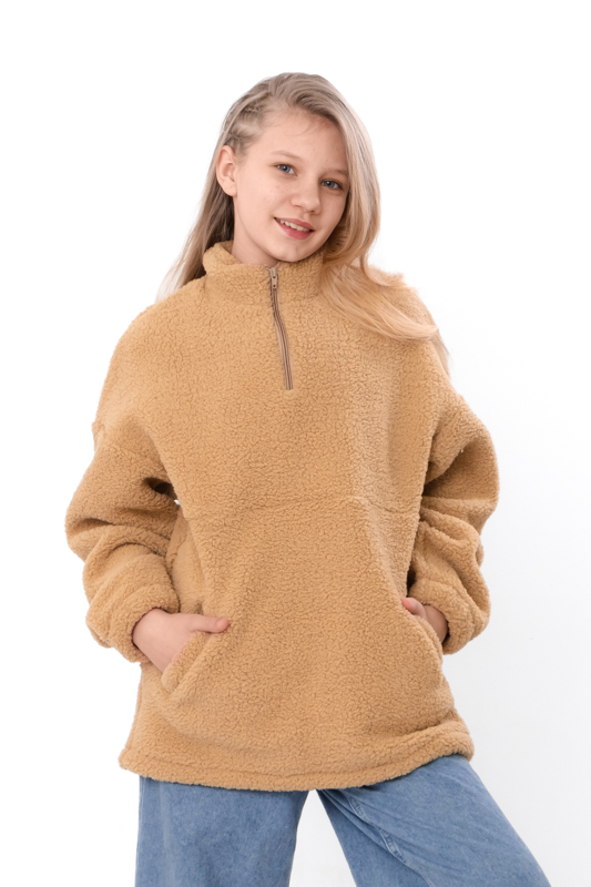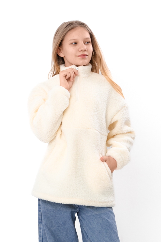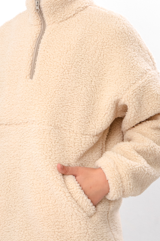 Модель має продуманий дизайн: вільний крій, високий комір-стійку на блискавці та зручну кишеню кенгуру. Така форма не сковує рухів, дозволяє активно проводити час і водночас виглядати стильно. Завдяки об’ємній фактурі хутра джемпер виглядає дуже затишно та трендово — саме так, як любить сучасна молодь.