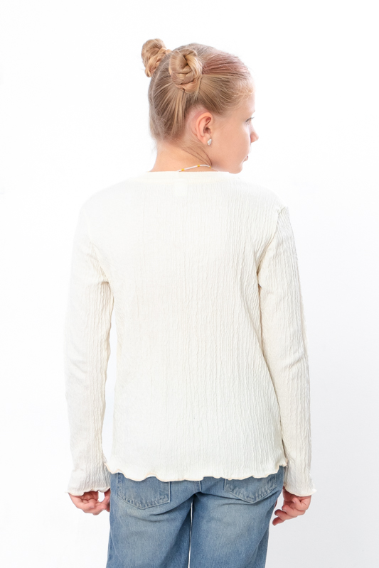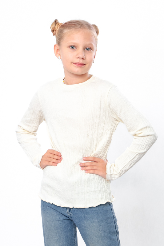 Комфортний та м'який на дотик джемпер для дівчинки з полотна - жатка. Модель прямого крою, з довгими рукавами та округлою горловиною. Джемпер чудово поєднується зі спідницями, джинсами та брюками. Полотно жатка зазвичай відрізняється текстурованою поверхнею, що створює об'ємний і структурований вигляд. Дане полотно має гарну повітропроникність і комфорт в носінні.
