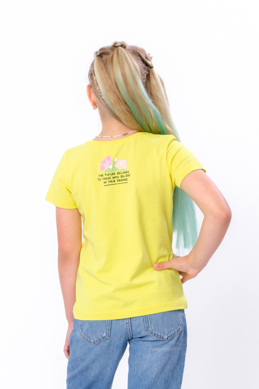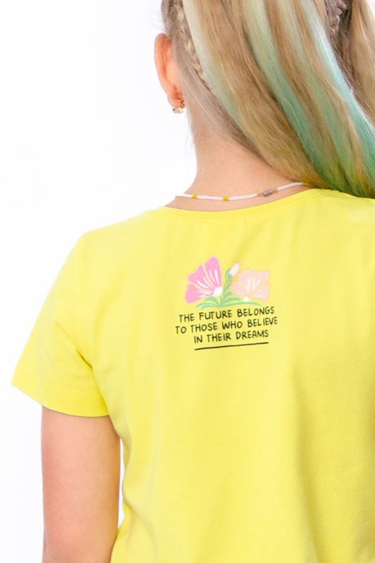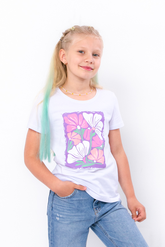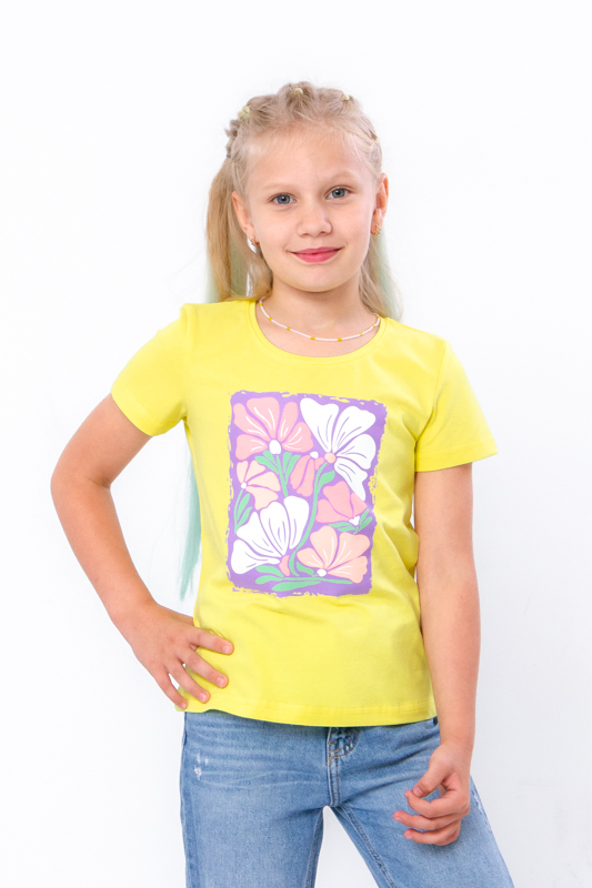 Яскрава футболка для дівчинки з однотонної фулікри. Футболка має короткі рукава та округлу горловину. Спереду на футболці нанесений яскравий квітковий принт, який обов'язково сподобається дівчаткам. Полотно гарної якості, при правильному догляді не дає усадку, не линяє, завдяки наявності еластану в складі не витягується.