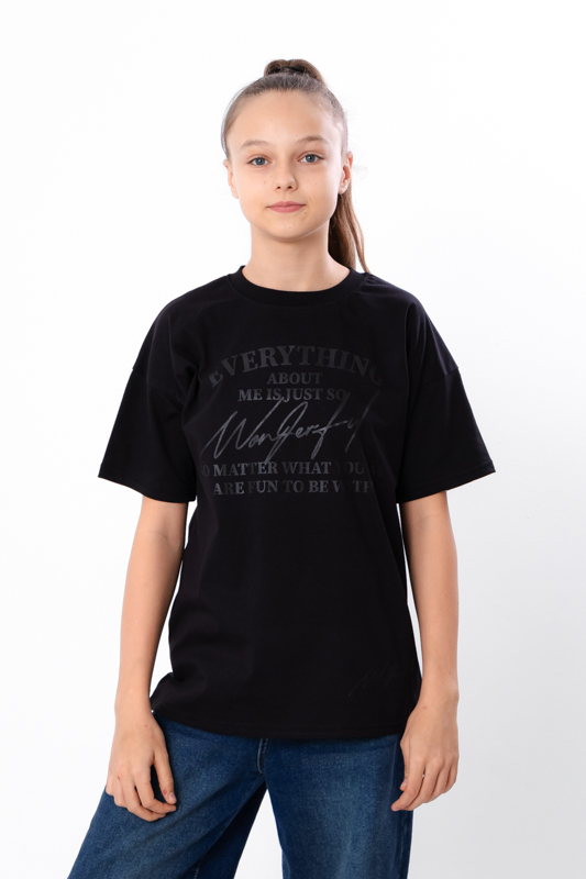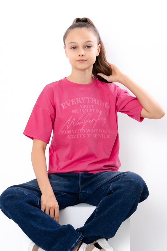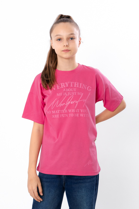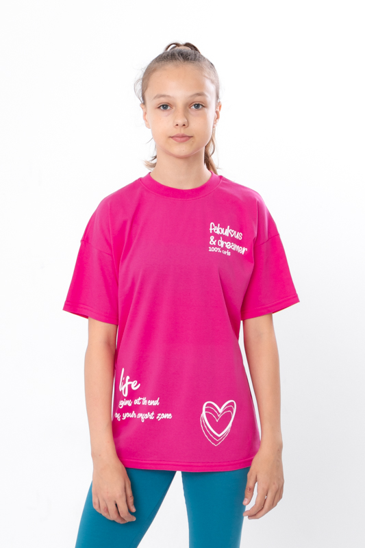 Стильна футболка для дівчинки з легкого куліру. Модель вільного крою, з короткими рукавами та округлим вирізом. Спереду має накатний малюнок. Відмінно комбінується з джинсами, шортами або лосинами. Полотно гарної якості, натуральне за складом, може давати невелику усадку.
