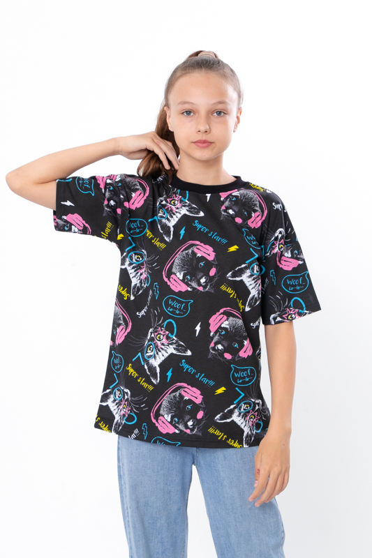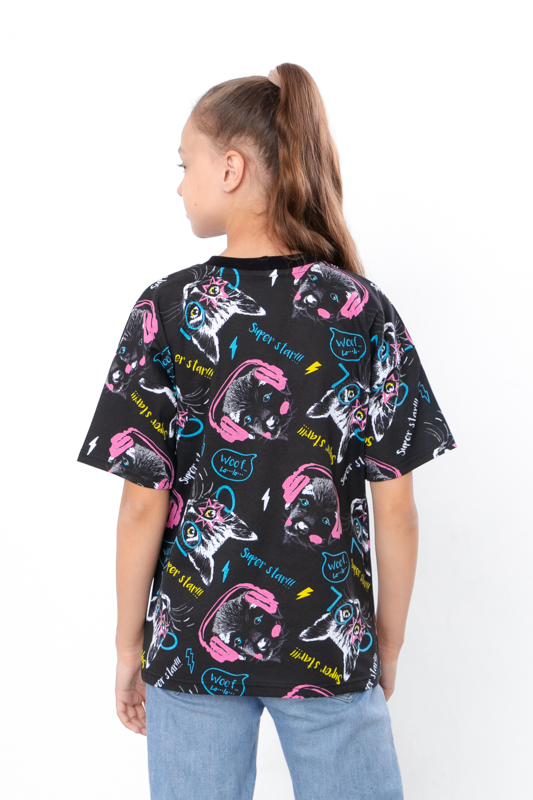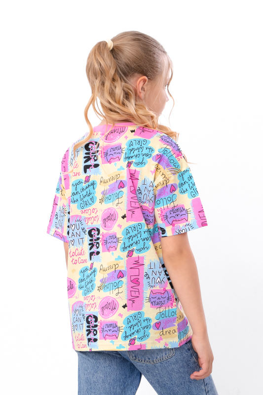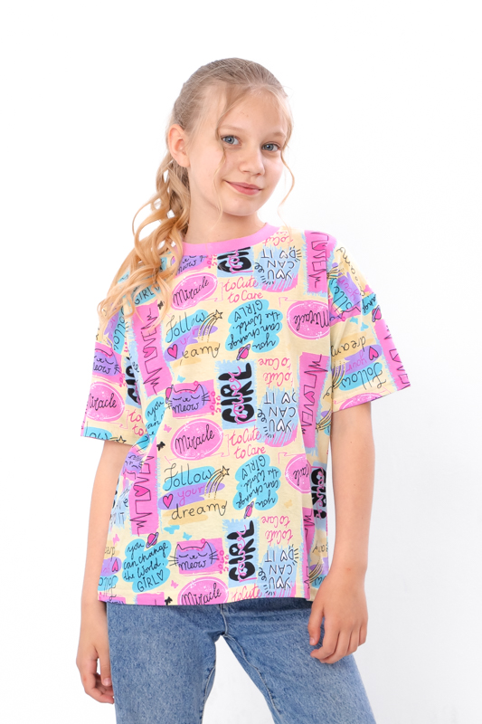 Футболка прямого крою з короткими рукавами та округлою горловиною забезпечує комфорт та стильний вигляд. Виготовлена з високоякісного принтованого куліру (100% бавовна), вона м'яка на дотик і чудово підходить для повсякденного носіння. Ця підліткова футболка для дівчинки стане чудовим доповненням до будь-якого гардеробу. Принтований кулір додає яскравості та оригінальності виробу, забезпечуючи комфорт під час носіння.