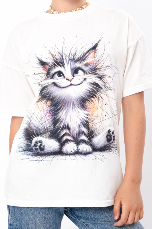Футболка має зручний прямий крій, короткий рукав і круглу горловину — все, що потрібно для щоденного комфорту. Акцентом виступає стильний принт, який додає виробу характеру та дозволяє легко поєднувати його з джинсами, шортами або спідницями. Принт створений із якісних фарб, що витримують багаторазове прання, зберігаючи яскравість і чіткість.