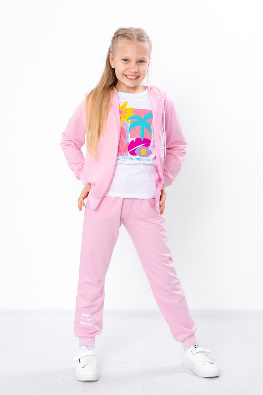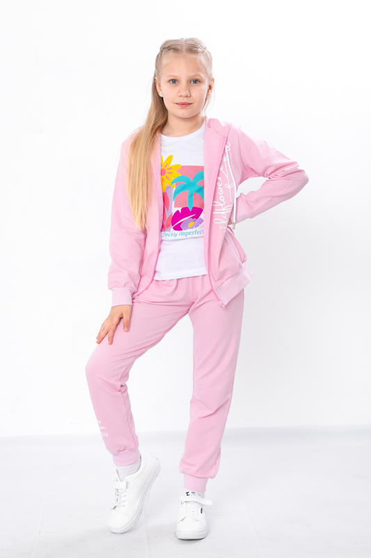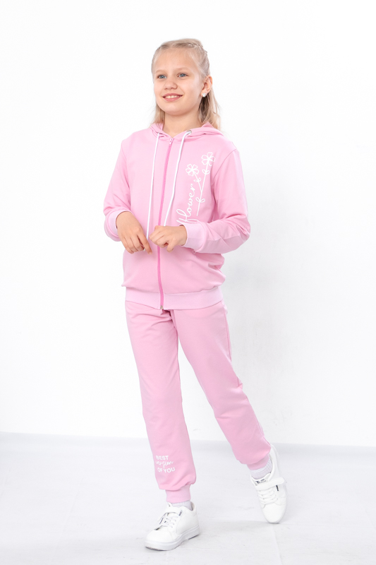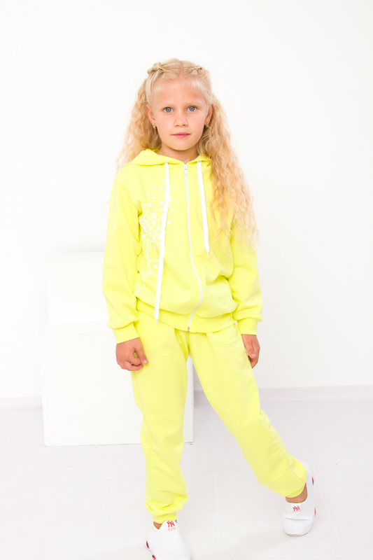 Стильний та практичний костюм для дівчинки з однотонної двонитки. Костюм складається з кофти на блискавці та штанів. Кофта з капюшоном, на рукавах і по низу кофти є широкі еластичні манжети. Штани на широкій резинці, по бокам кишені, знизу на штанинах також широкі манжети. Костюм прикрашений стильним накатом, пошит в актуальних кольорах, які обов’язково сподобаються дівчаткам. Такий костюм чудово підходить для повсякденного носіння та активних прогулянок. Костюм пошитий з однотонної двонитки. Полотно гарної якості. Тому, при правильному догляді, його можна буде носити не один сезон. Може давати усадку після прання.
