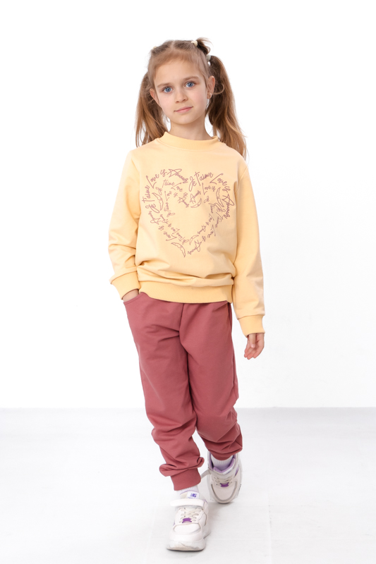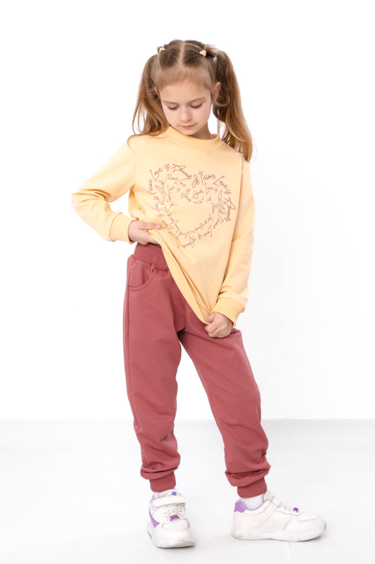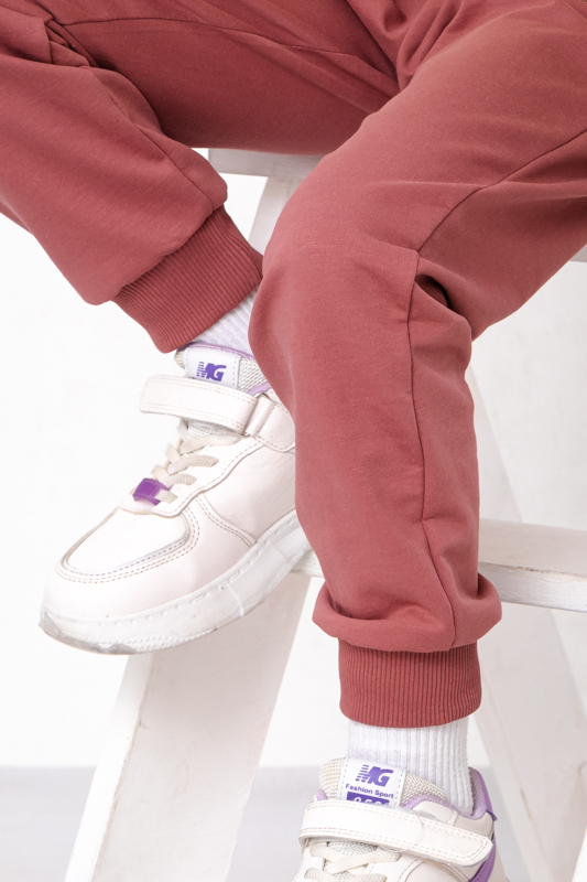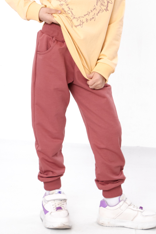 Штани виконані в єдиному стилі зі світшотом, що забезпечує гармонійний вигляд усього комплекту. Вони мають комфортну посадку та не обмежують рухів, що особливо важливо для активних дітей. Наявність кишень додає практичності, дозволяючи зручно зберігати дрібні речі або просто зігріти руки під час прогулянок. Завдяки продуманому крою, штани добре тримаються на талії та забезпечують максимальний комфорт у носінні.