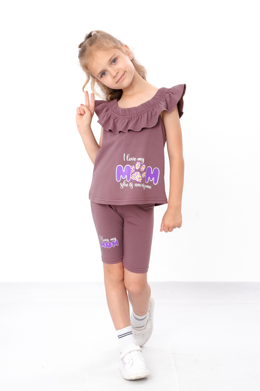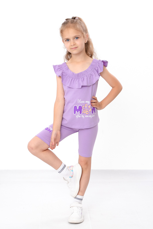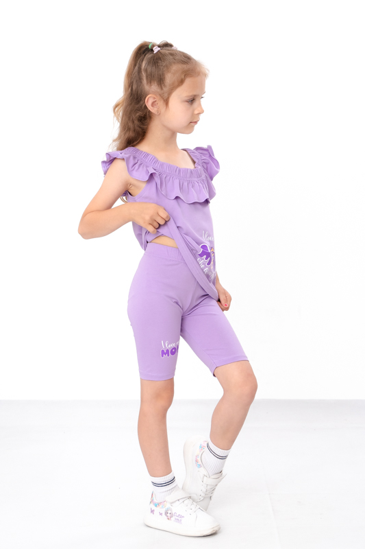 Легкий літній комплект для дівчаток з еластичного трикотажного полотна фулікра, складається з футболки і велосипедок. Футболка має широку горловину на резинці та прикрашена рюшею. Велосипедки на резинці. Комплект прикрашен накатним малюнком в якості декору. Комплект стане незамінним в гардеробі юних модниць спекотним літом, доповнити образ можна кросівками, кедами або спортивними босоніжками. Полотно відмінної якості, при правильному догляді не дає усадку, завдяки наявності еластану в складі не витягуєтьтся.