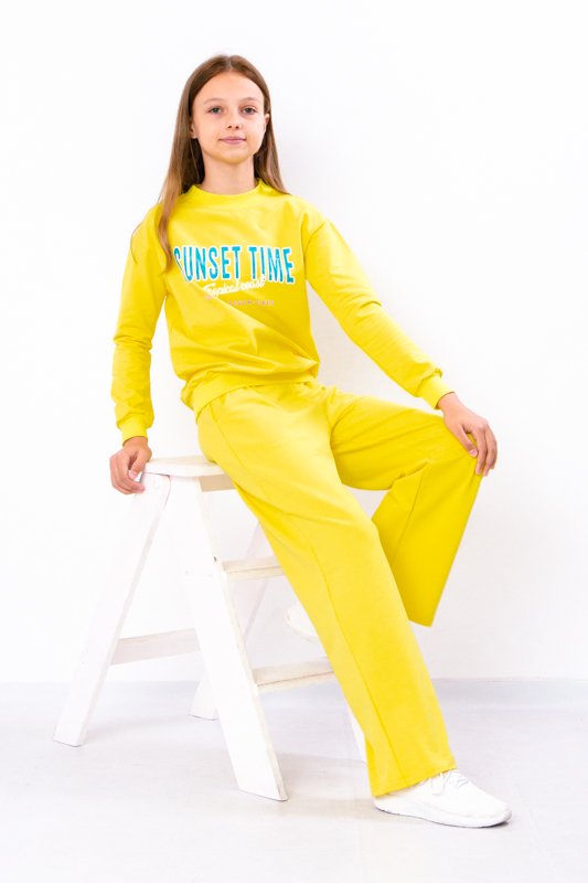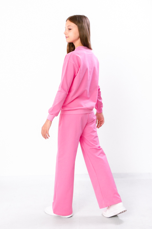 Стильний комплект для дівчаток з однотонної двонитки. Комплект складається з джемпера та популярних штанів палаццо. Спереду джемпер прикрашено накатним малюнком, рукава мають спущену лінію плечей. Штани середньої посадки на широкій резинці в поясі. Костюм можна доповнити кросівками або кедами. Підходить для повсякденного носіння, занять спортом або активних прогулянок. Полотно гарної якості. Тому, при правильному догляді, виріб можна буде носити не один сезон. Може давати усадку після прання.