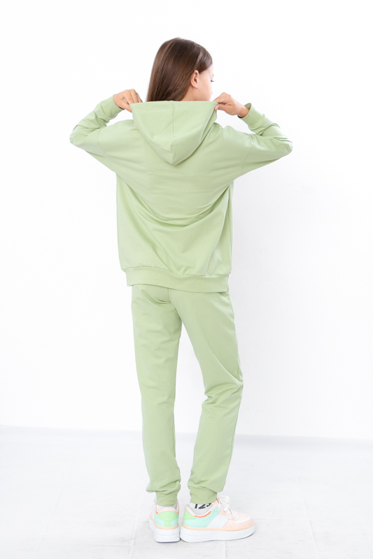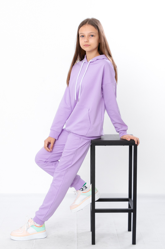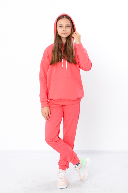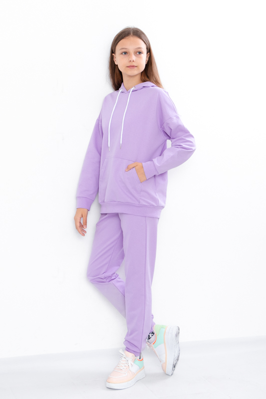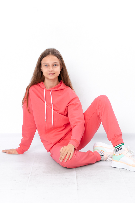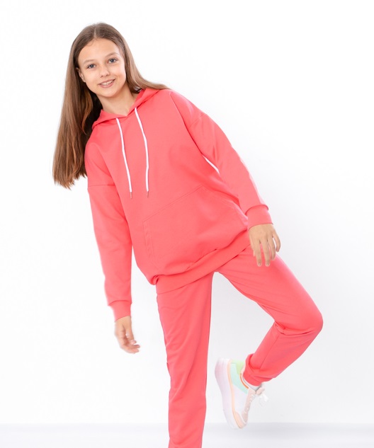 Костюм для дівчаток-підлітків з однотонної двонитки. Худі вільного крою, з довгими рукавами на манжетах, капюшоном і місткою кишенею-кенгуру. Штани з боковими кишенями, на манжетах, поясом на широкій резинці. Костюм підходить для прогулянок, занять спортом, активного відпочинку. Доповнити образ можна кросівками, кедами. Полотно гарної якості. Тому, при правильному догляді, костюм можна буде носити не один сезон. Може давати усадку після прання.