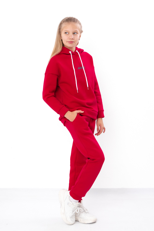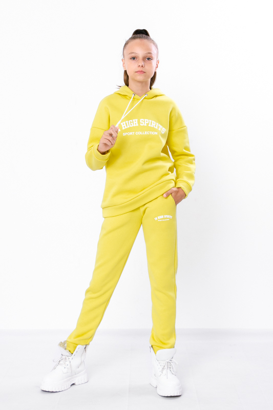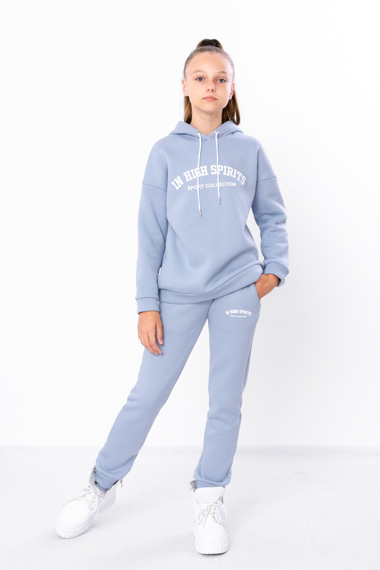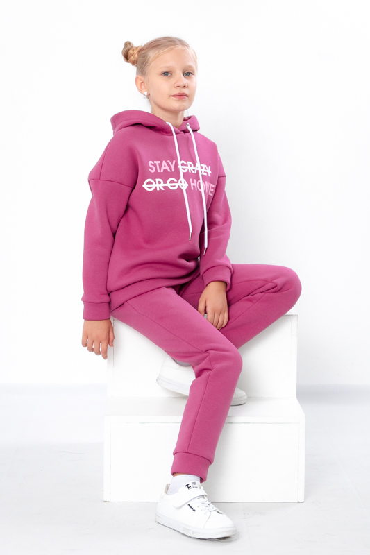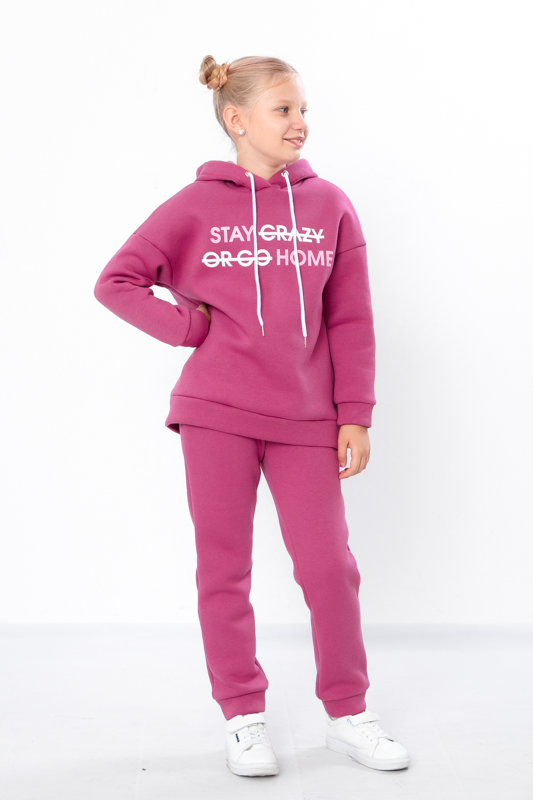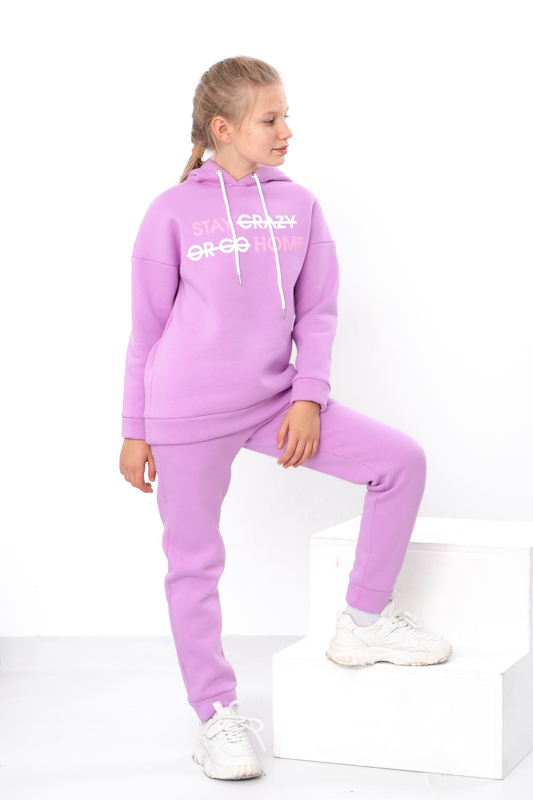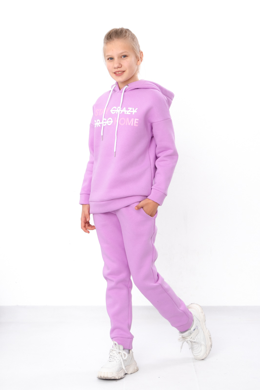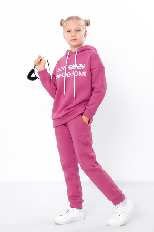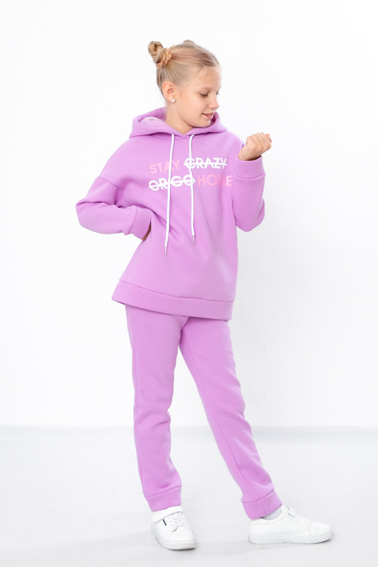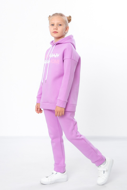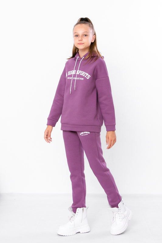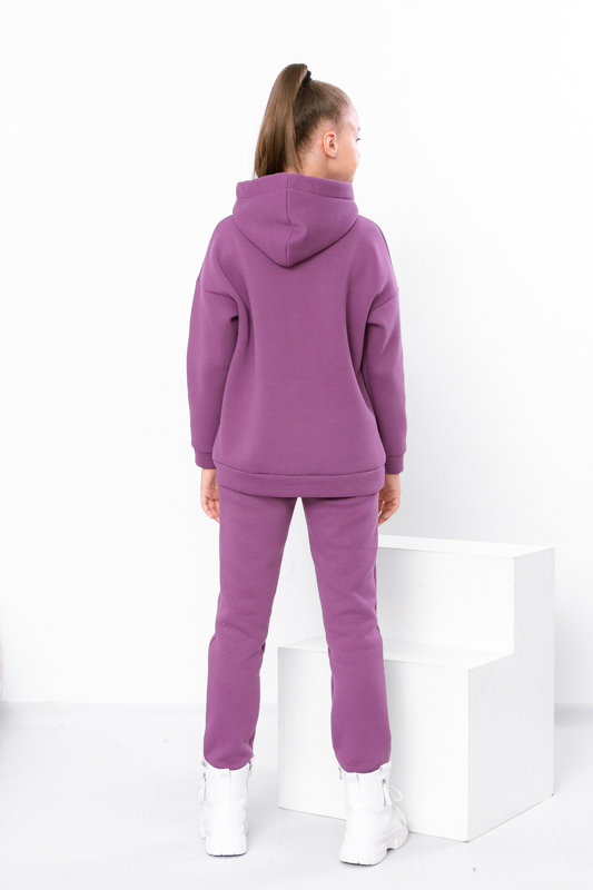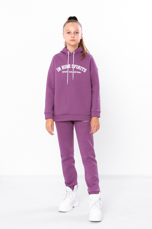 Стильний та дуже теплий костюм для дівчаток виконан з однотонної тринитки на начосі. Складається з худі та штанів. Худі з капюшоном. Лінія плечей на рукавах спущена. Штани прямого крою, пояс на широкій зручній резинці, по бокам є кишені. Костюм пошит в декількох відтінках, спереду прикрашений накатним малюнком. Такий костюм відмінно підходить на холодну погоду. Полотно щільне, має густий начіс з виворітної сторони, гарно зберігає тепло.