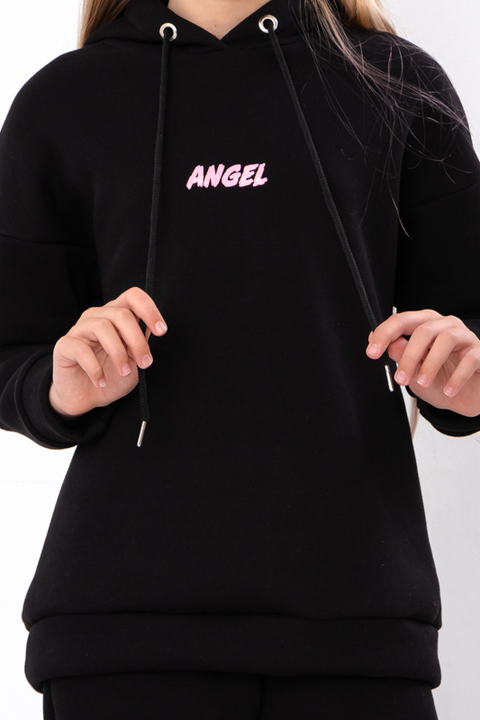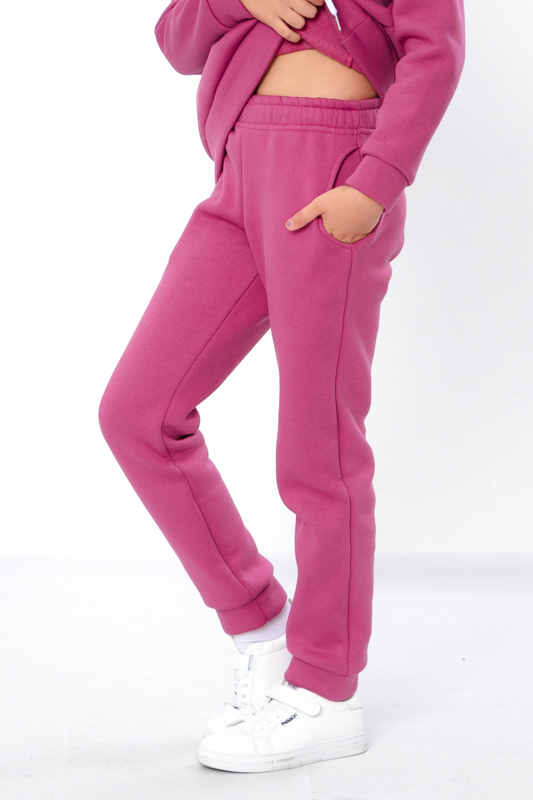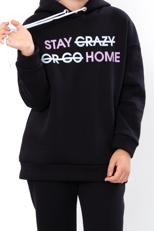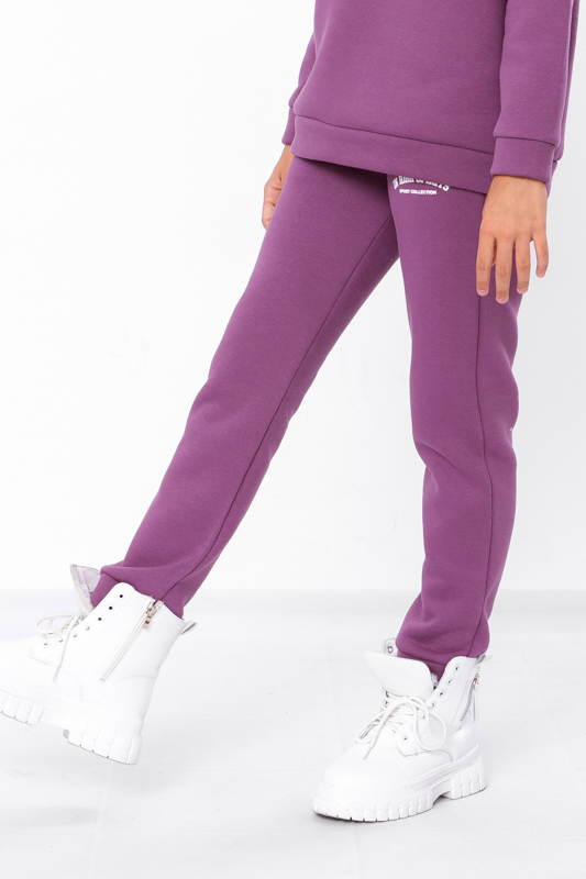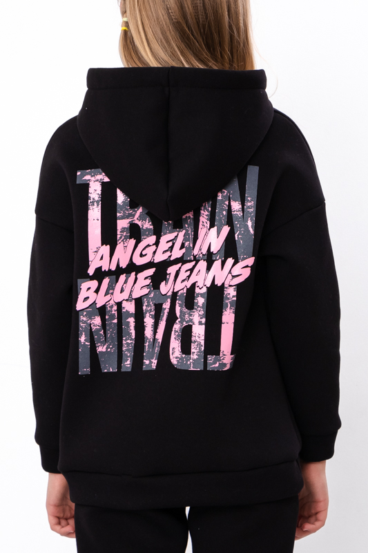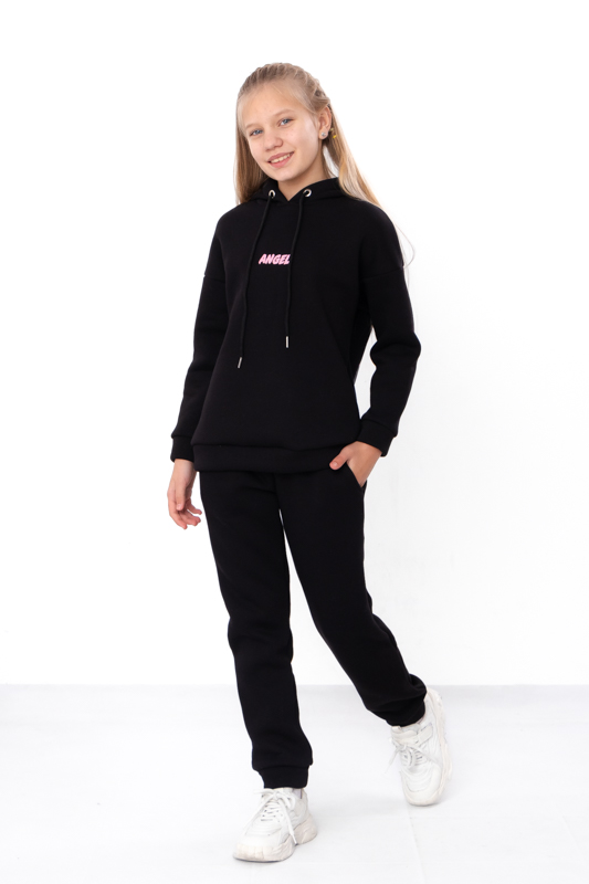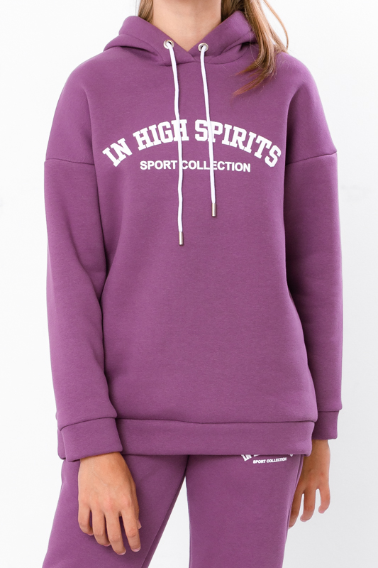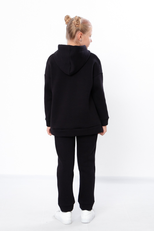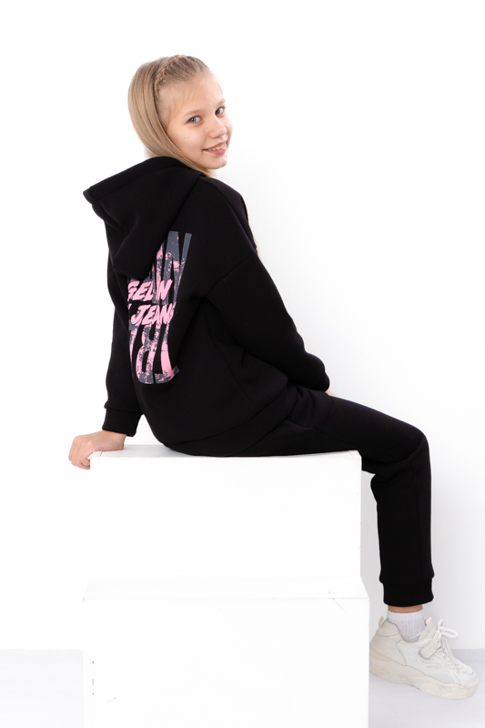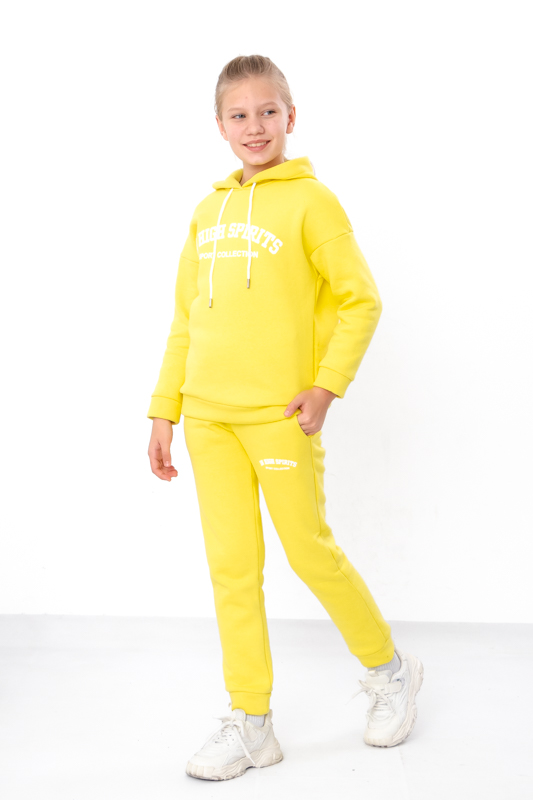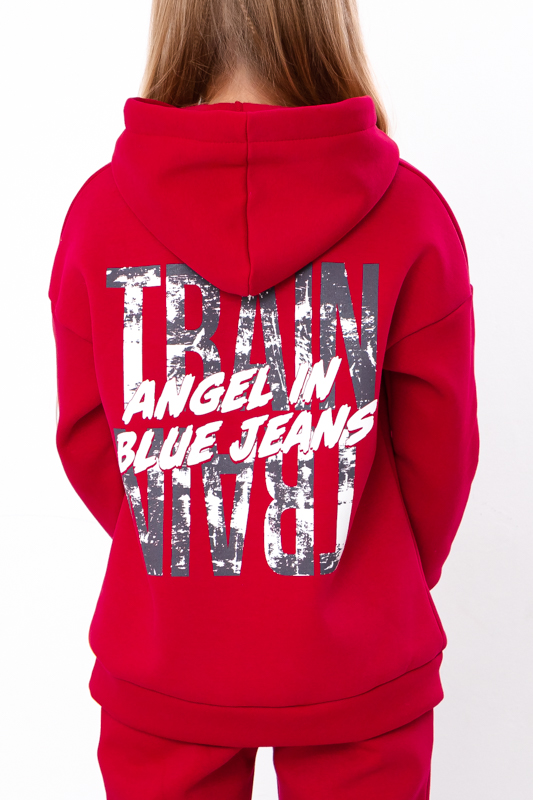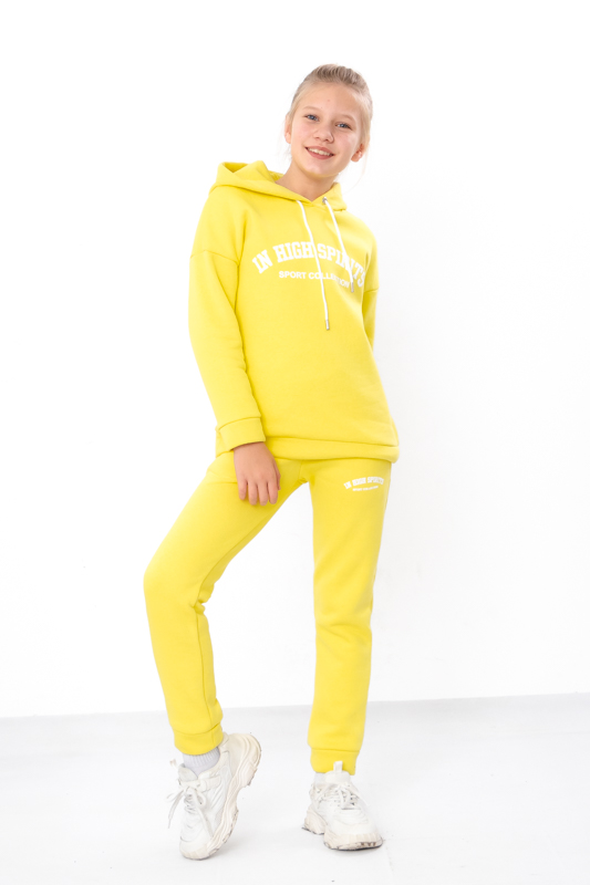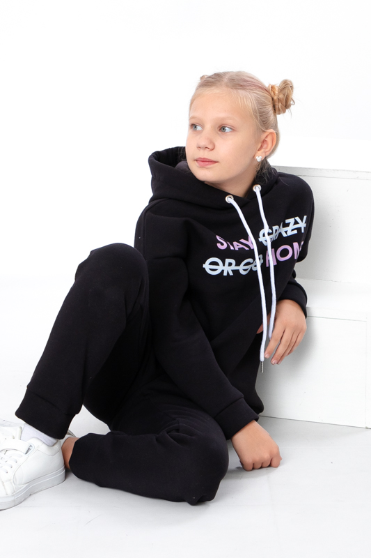 Стильний та дуже теплий костюм для дівчаток виконан з однотонної тринитки на начосі. Складається з худі та штанів. Худі з капюшоном. Лінія плечей на рукавах спущена. Штани прямого крою, пояс на широкій зручній резинці, по бокам є кишені. Костюм пошит в декількох відтінках, спереду прикрашений накатним малюнком. Такий костюм відмінно підходить на холодну погоду. Полотно щільне, має густий начіс з виворітної сторони, гарно зберігає тепло.
