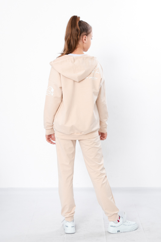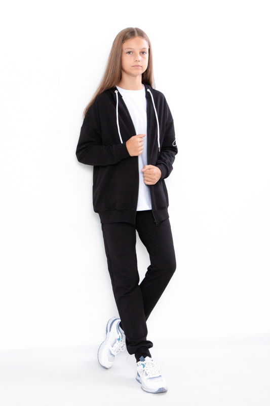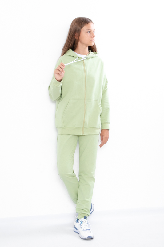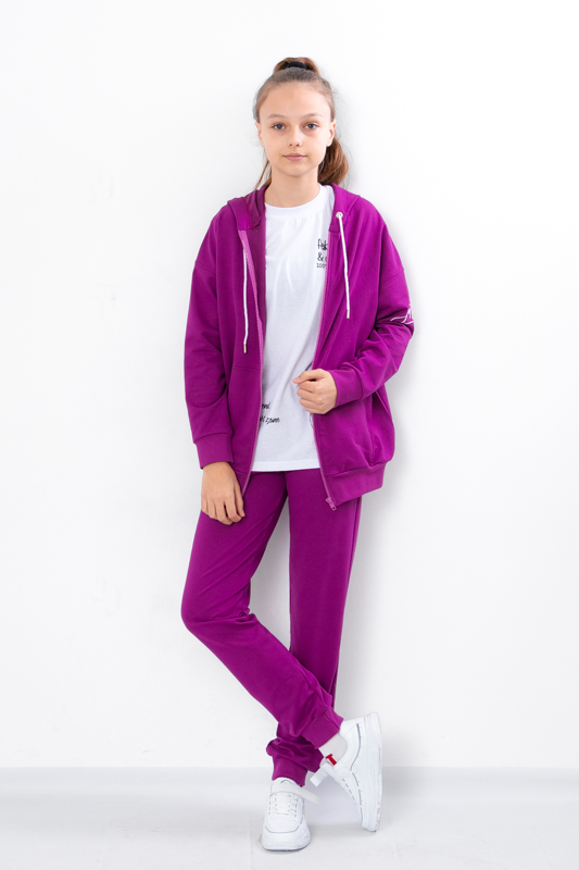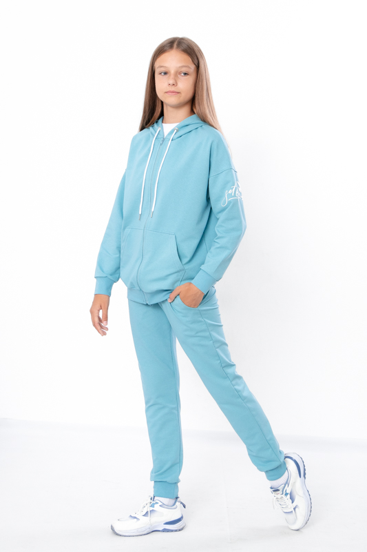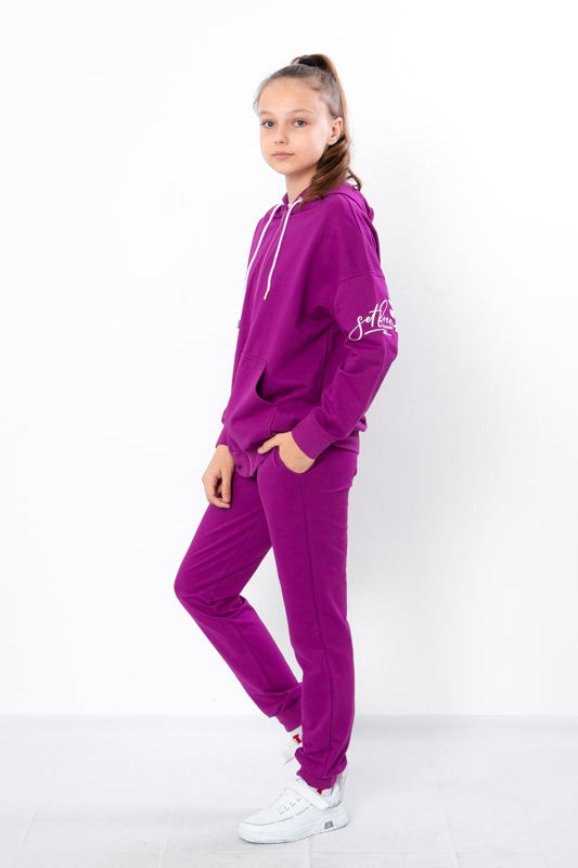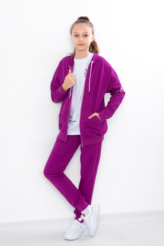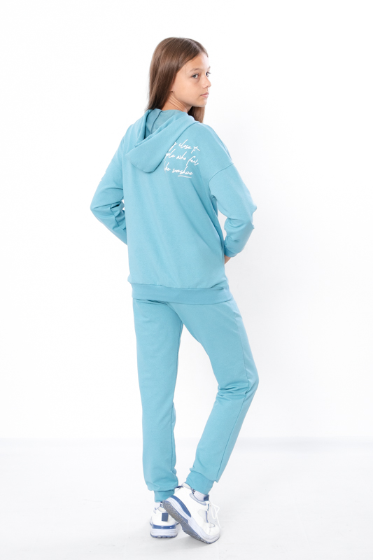 Костюм для дівчаток-підлітків з однотонної двонитки. Кофта вільного крою, з довгими рукавами на манжетах, капюшоном, застібається на блискавку. По бокам дві кишені. На спині та на рукаві нанесений невеликий малюнок в якості декору. Штани з боковими кишенями, на манжетах, поясом на широкій резинці. Костюм підходить для прогулянок, занять спортом, активного відпочинку. Доповнити образ можна кросівками, кедами. Полотно гарної якості. Тому, при правильному догляді, виріб можна буде носити не один сезон. Може давати усадку після прання.