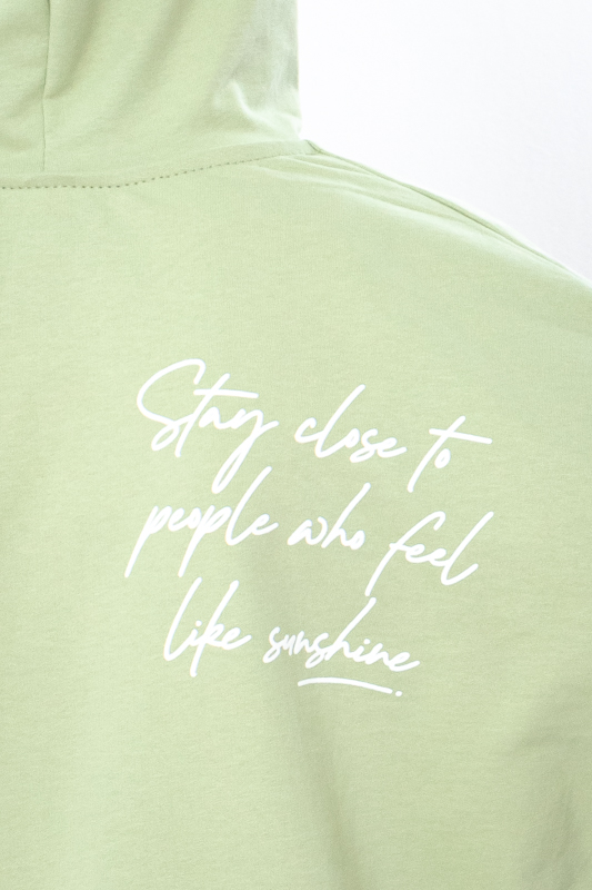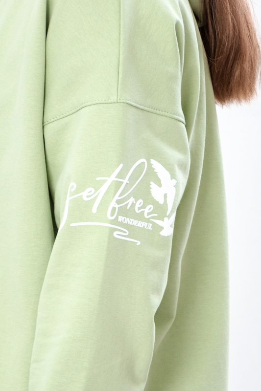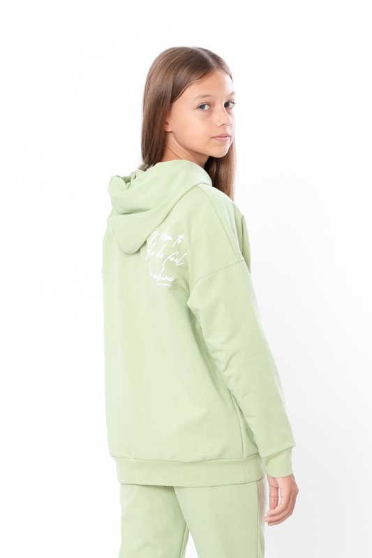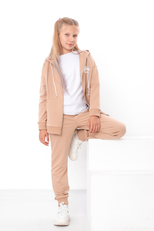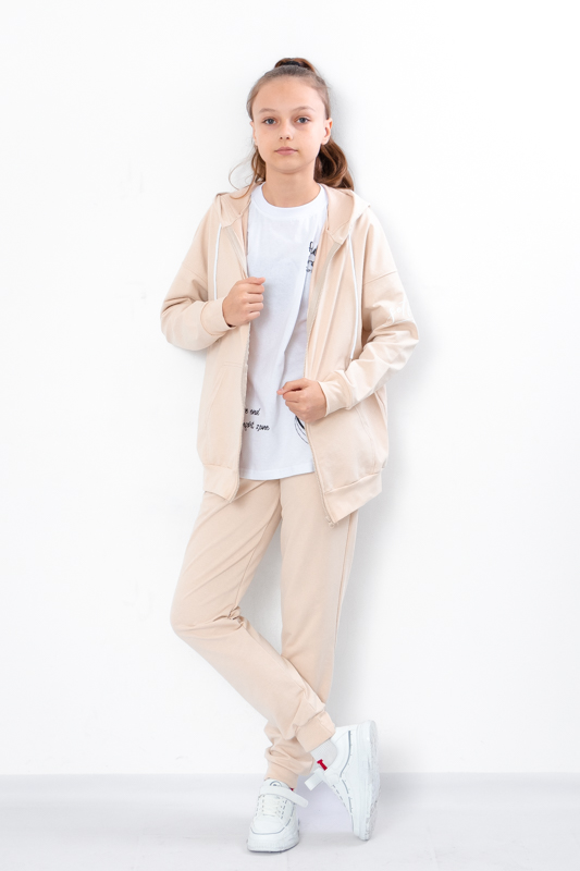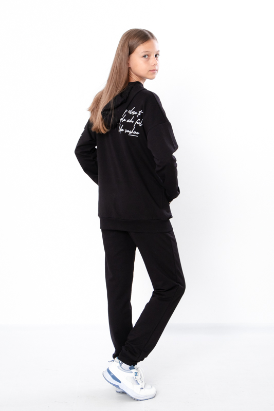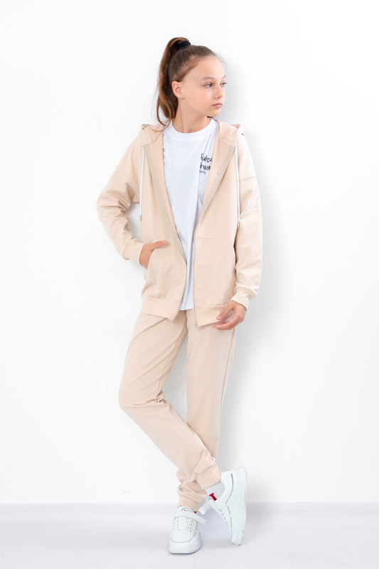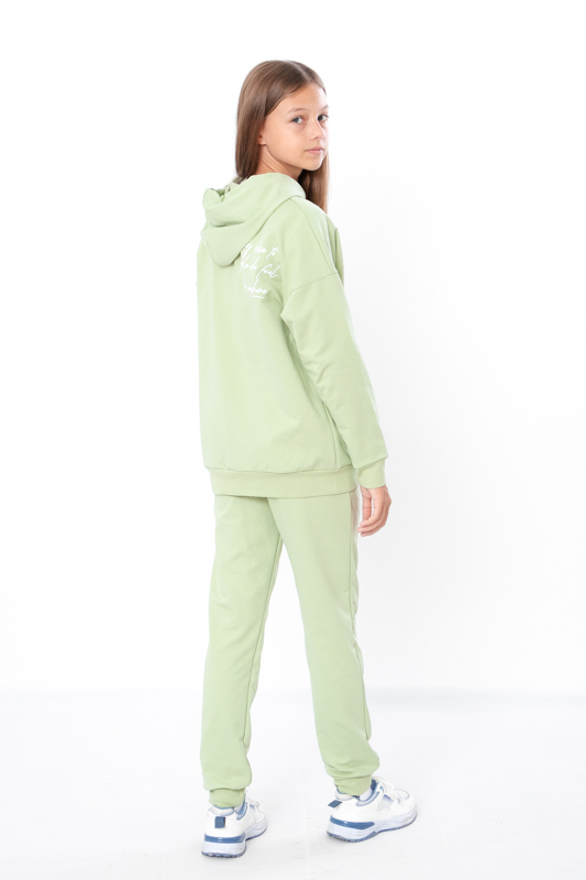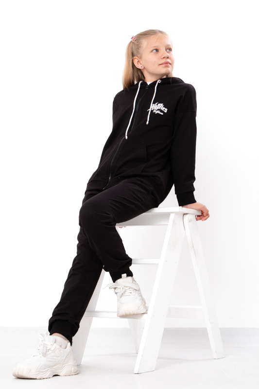 Костюм для дівчаток-підлітків з однотонної двонитки. Кофта вільного крою, з довгими рукавами на манжетах, капюшоном, застібається на блискавку. По бокам дві кишені. На спині та на рукаві нанесений невеликий малюнок в якості декору. Штани з боковими кишенями, на манжетах, поясом на широкій резинці. Костюм підходить для прогулянок, занять спортом, активного відпочинку. Доповнити образ можна кросівками, кедами. Полотно гарної якості. Тому, при правильному догляді, виріб можна буде носити не один сезон. Може давати усадку після прання.