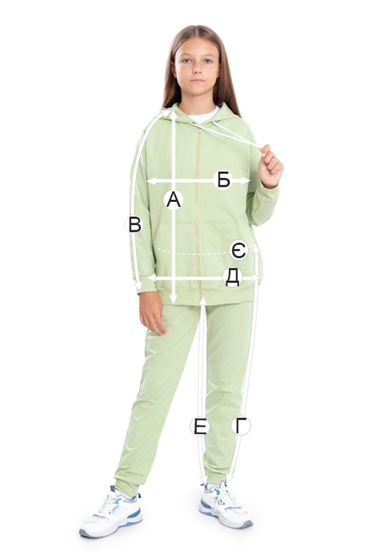 | Г - Довжина штанів по бічному шву, +/-2см | 82 | 86 | 90 | 94 | 97 | 100 |