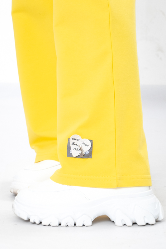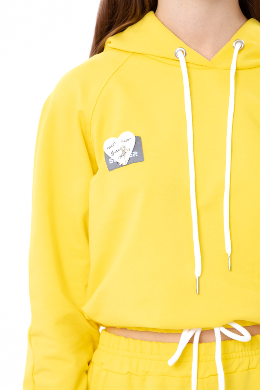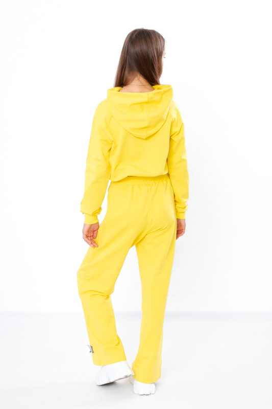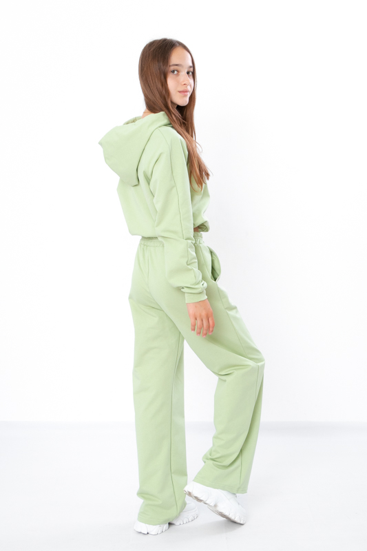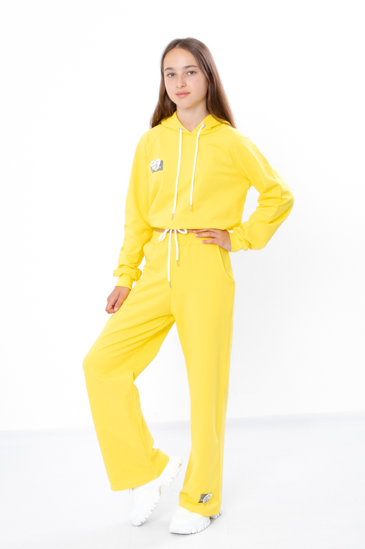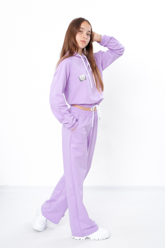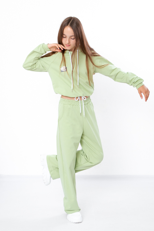 Ультрамодний костюм для дівчаток-підлітків пошитий з однотонної двонитки. Модель складається з джемперу з капюшоном та штанів. Джемпер укороченого крою, рукава-реглани, знизу є резинка та ще додатково шнурок. Штани широкого вільного крою, також на резинці, що додатково затягується шнурком. По бокам є дві кишені. На джемпері та знизу на штанах є невелика нашивка в якості декору. Модель представлена у декількох кольорах, підійде на будь-який смак. Полотно гарної якості. Тому, при правильному догляді, костюм можна буде носити не один сезон. Може давати усадку після прання.