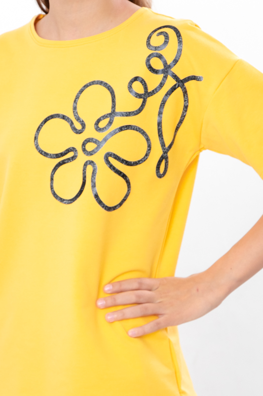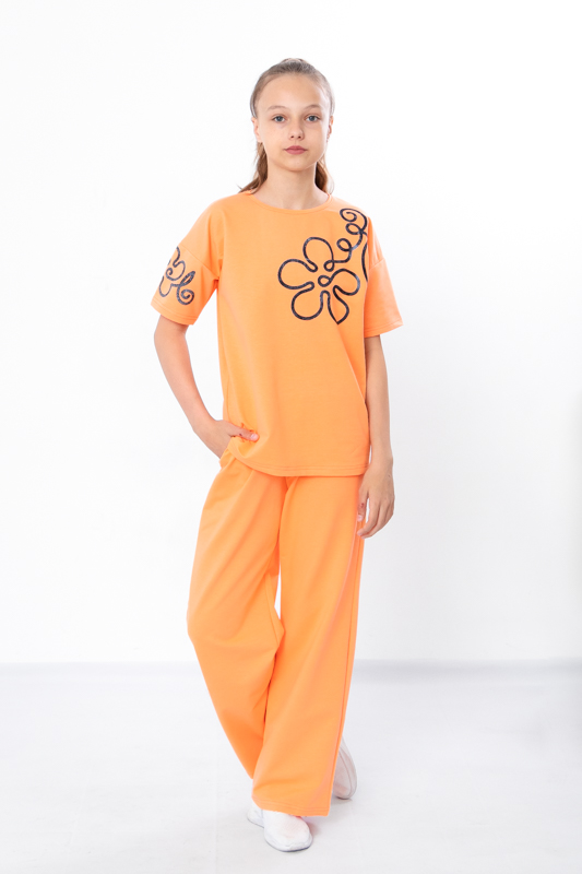 Комплект для дівчат-підлітків з однотонної двонитки, складається з футболки та широких штанів. Футболка вільного крою, з короткими рукавами і округлим вирізом, лінія плеча спущена. На футболці виконано принтом . Широкі штани на резинці, мають дві кишені по бокам. Образ можна доповнити стильними кросівками, кедами або спортивними босоніжками. Полотно гарної якості. Тому, при правильному догляді, комплект можна буде носити не один сезон. Може давати усадку після прання.