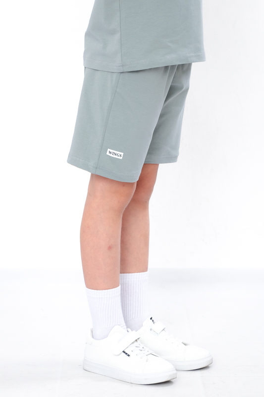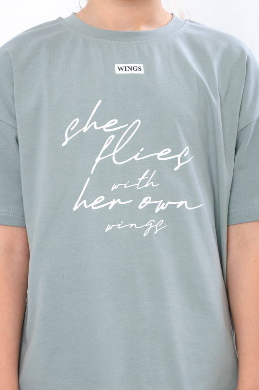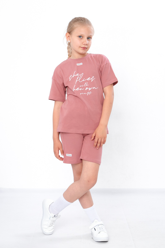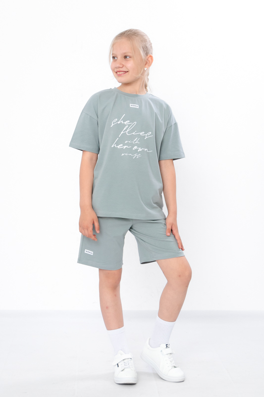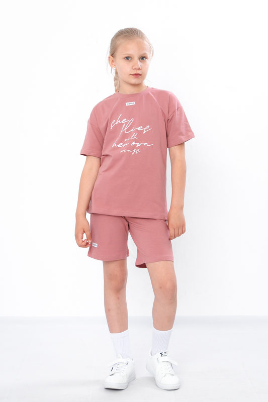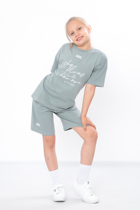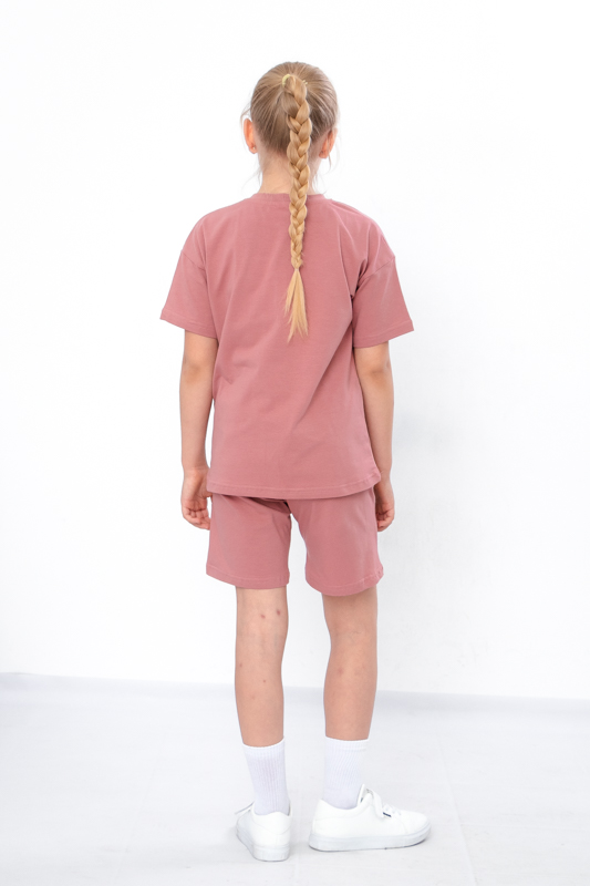 Літній комплект для дівчаток складається з футболки вільного крою та шортів. Пошитий з однотонної фулікри. Футболка з короткими рукавами та округлим вирізом, доповнена спереду стильним накатом. Лінія плеча трохи спущена. Шорти на резинці, з високою посадкою, мають дві кишені.