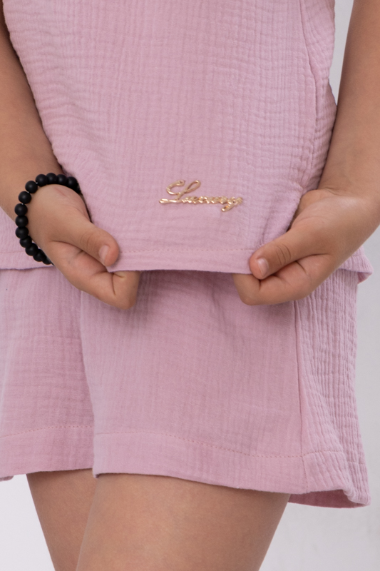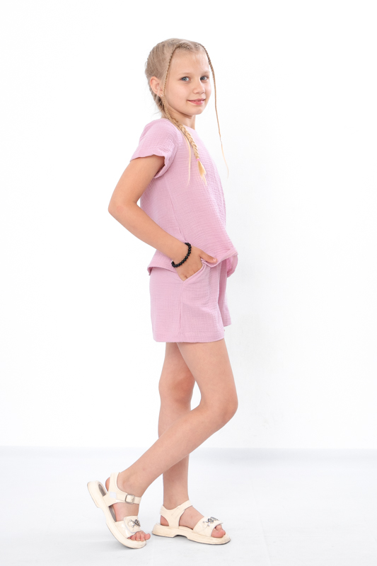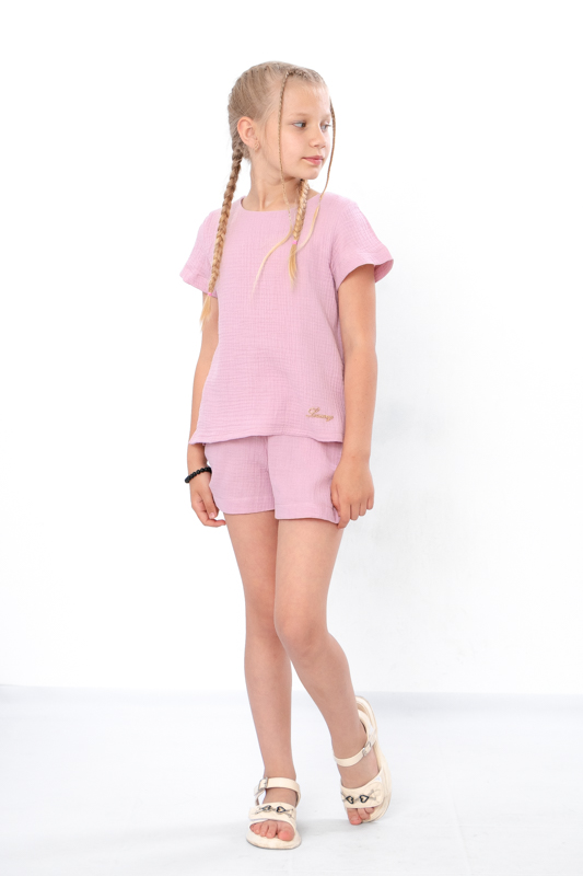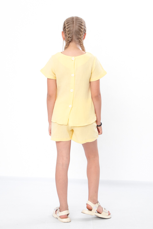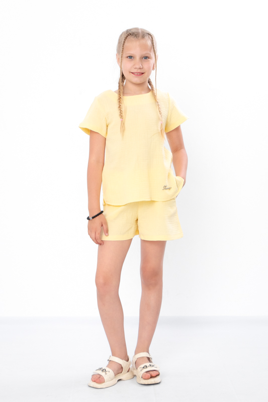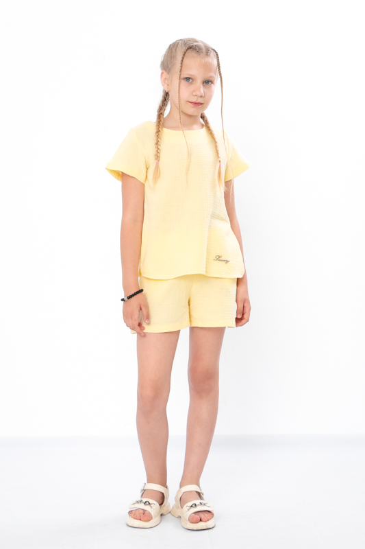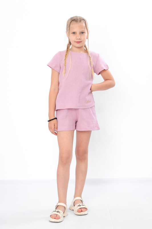 Комплект з мусліну - ідеальне поєднання комфорту та стилю для спекотних літніх днів. Поєднання натурального матеріалу та вільного крою робить його ідеальним вибором для повсякденного носіння та прогулянок містом. Комплект складається з блузи та шортів. Блуза виготовлена з м'якого мусліну, що забезпечує неймовірну легкість та повітропроникність. Круглий виріз та короткі рукави роблять блузу універсальною для будь-якого образу. На спині зроблена імітація застібки на гудзики. Шорти також виготовлені з мусліну. Мають дві кишені по бокам. Вільний крій дозволяє шкірі дихати та забезпечує максимальну свободу рухів. Цей комплект дозволить почуватися комфортно протягом літа. Гарно поєднується з босоніжками або кедами.