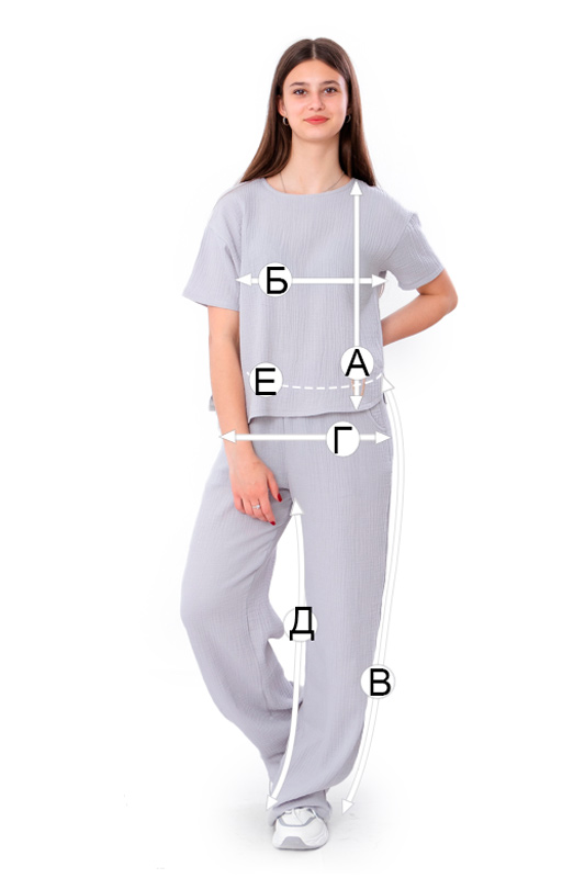 Комплект з мусліну - ідеальне поєднання комфорту та стилю для спекотних літніх днів. Поєднання натурального матеріалу та вільного крою робить його ідеальним вибором для повсякденного носіння та прогулянок містом. Комплект складається з блузи та штанів. Блуза виготовлена з м'якого мусліну, що забезпечує неймовірну легкість та повітропроникність. Круглий виріз та короткі рукави роблять блузу універсальною для будь-якого образу. На спині зроблена імітація застібки на гудзики. Також на блузі є невелика нашивка в якості декору. Штани мають вільний прямий крій, дві кишені по бокам. Вільний крій дозволяє шкірі дихати та забезпечує максимальну свободу рухів. Цей комплект дозволить почуватися комфортно протягом літа. Гарно поєднується з босоніжками, кедами або кросівками.