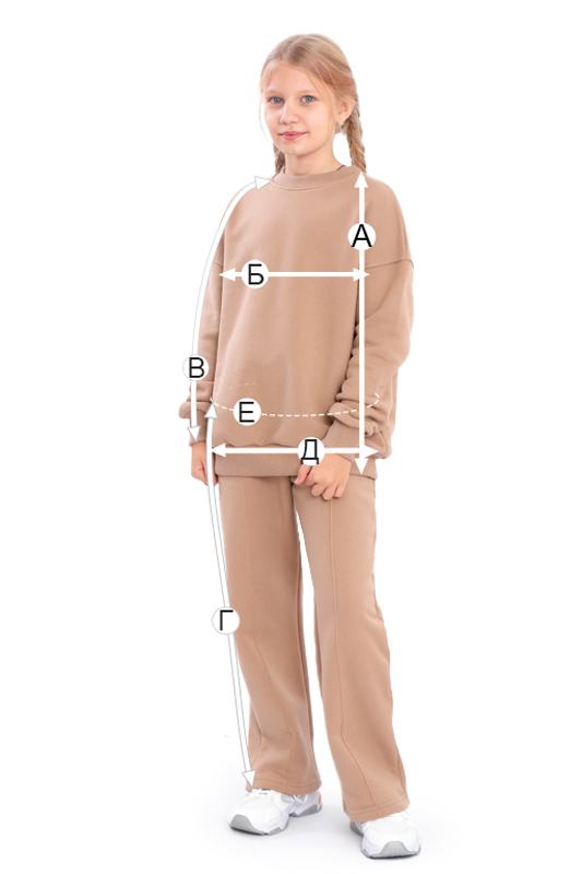 Костюм складається з світшота та штанів палаццо. Світшот має прямий крій та довгі рукави з манжетами на кінцях. Широкі прямі штани зі стрілками мають зручний крій, що не сковує рухів, ідеально підходять для активного дня. А бічні кишені додають практичності, дозволяючи носити необхідні речі.