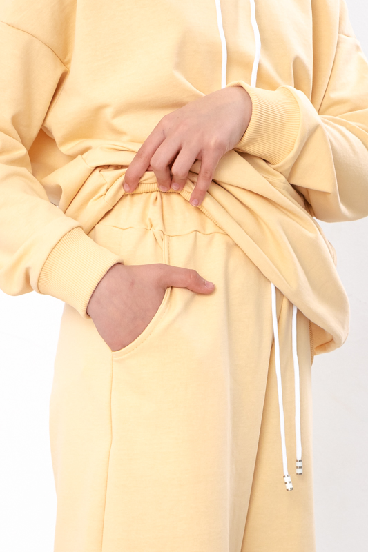 Світшот у цьому комплекті має зручний, трохи вільний крій, що дозволяє легко рухатися і відчувати себе впевнено у будь-якій ситуації. Він гарно сідає по фігурі, створюючи акуратний силует, а також чудово поєднується з іншими елементами гардероба. Капюшон додає образу сучасності та практичності, захищаючи від прохолоди та вітру. Завдяки продуманому дизайну, світшот виглядає стильно та доречно як для активного дня, так і для спокійного відпочинку.