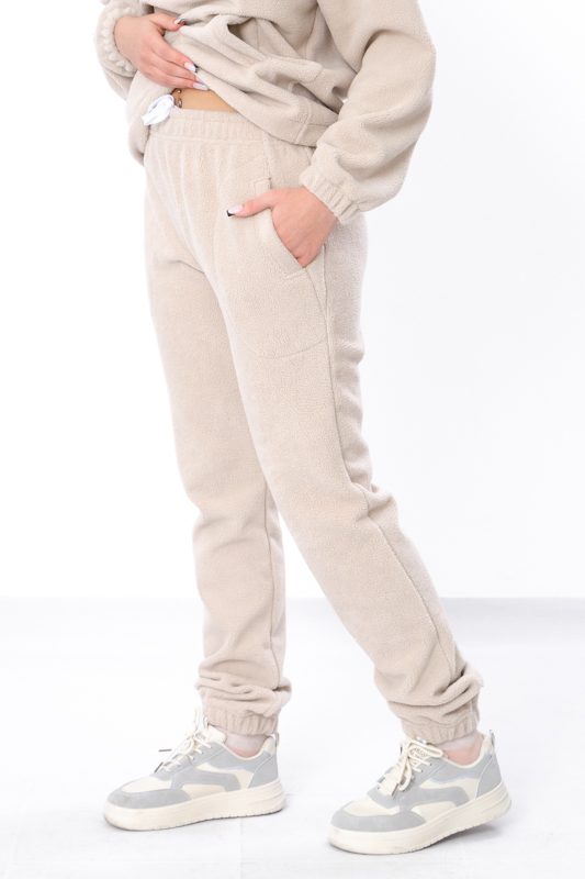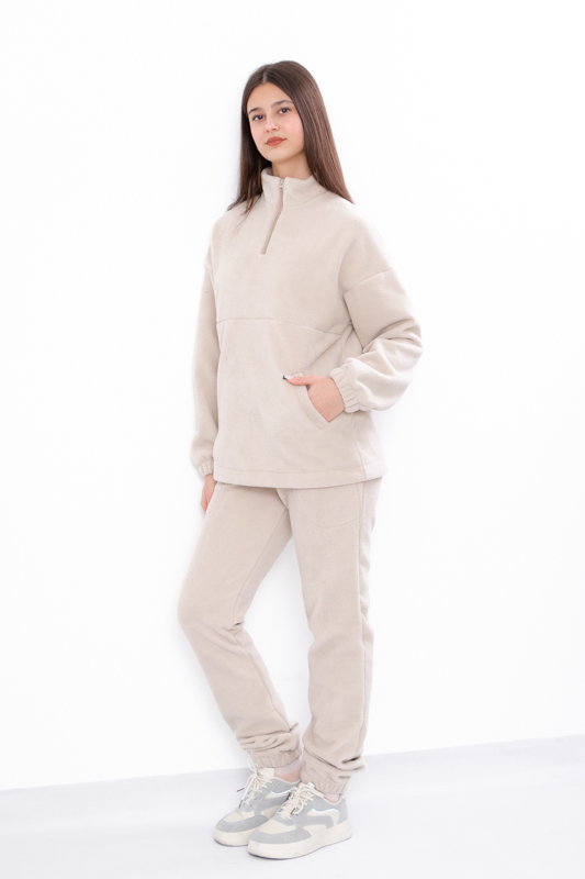 Кофта цього костюма має практичну застібку до середини, що дозволяє легко одягати та знімати річ, а також забезпечує регулювання температури залежно від погодних умов. Зручні кишені на кофті додають функціональності — у них можна сховати маленькі дрібниці або просто зігріти руки. Штани доповнені манжетами з резинкою, які надійно фіксують їх на щиколотках, не даючи холоду проникати, і при цьому не обмежують рухів.
