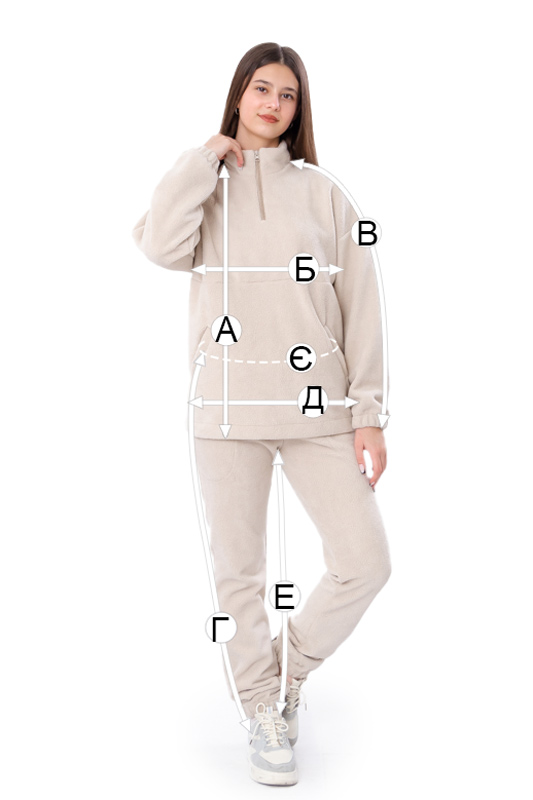 | Г - Довжина штанів по бічному шву, +/-2см | 85 | 89 | 93 | 96 | 100 | 103 |