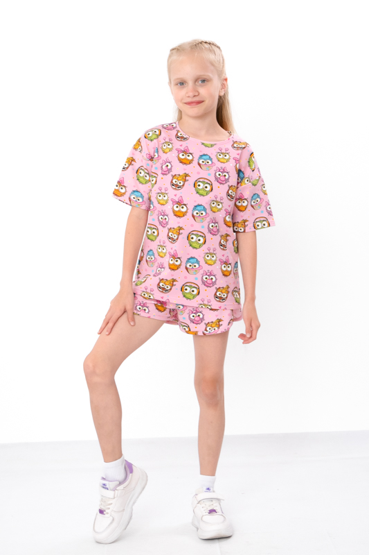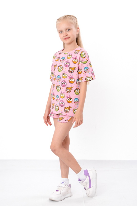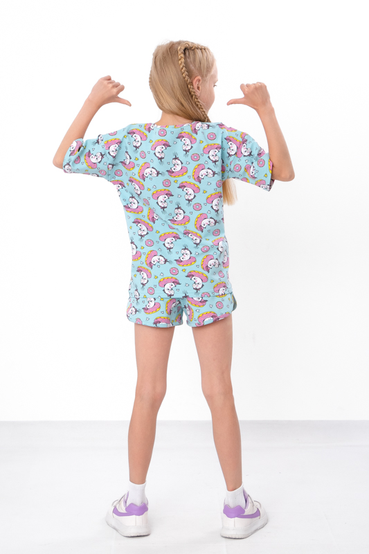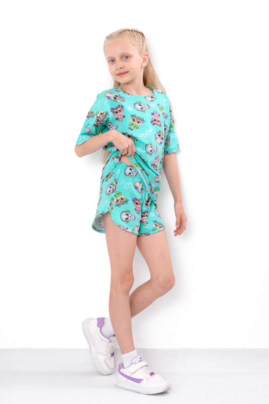 Шорти мають середню довжину та комфортну посадку. М’яка резинка на поясі надійно фіксує виріб, не перетискаючи животик, а вільний крій забезпечує свободу рухів. Вони виготовлені з того самого матеріалу, що й футболка, тому комплект виглядає гармонійно й стильно.