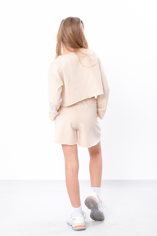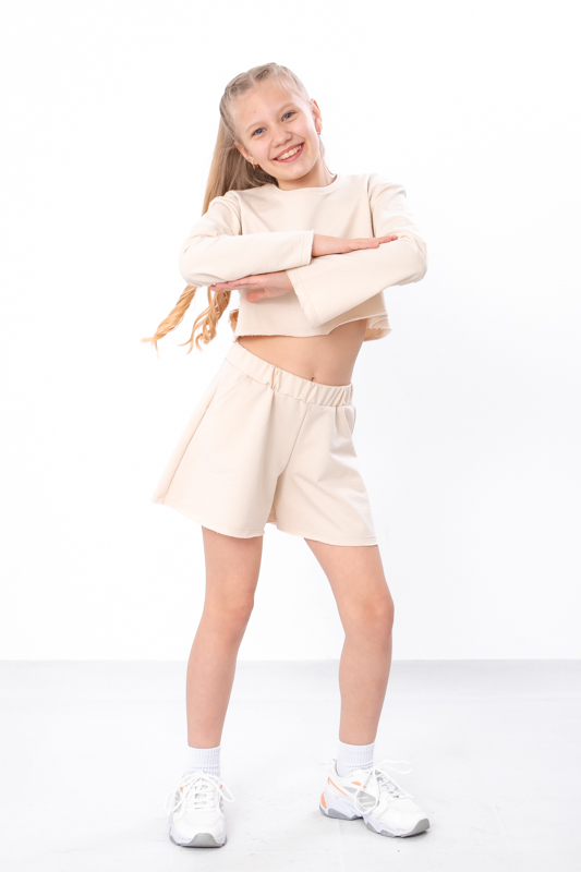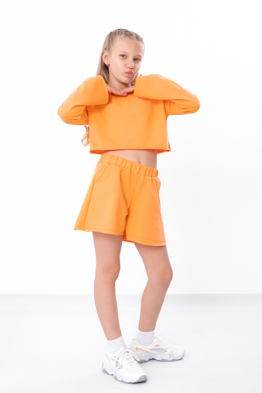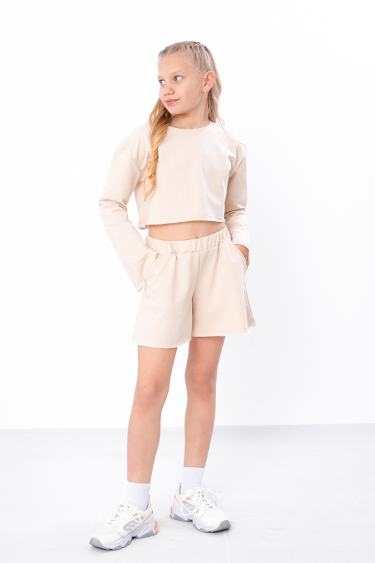 Комплект для дівчинки-підлітка з двонитки, однотонний — це стильний, зручний і практичний варіант одягу для активного відпочинку, прогулянок або повсякденного носіння у теплу пору року. До складу комплекту входить укорочена кофта з рукавами та шорти вільного крою з кишенями, які забезпечують максимальний комфорт та свободу рухів.