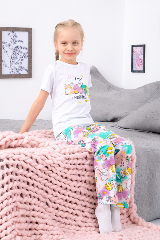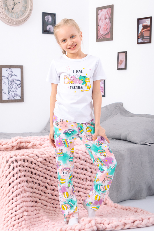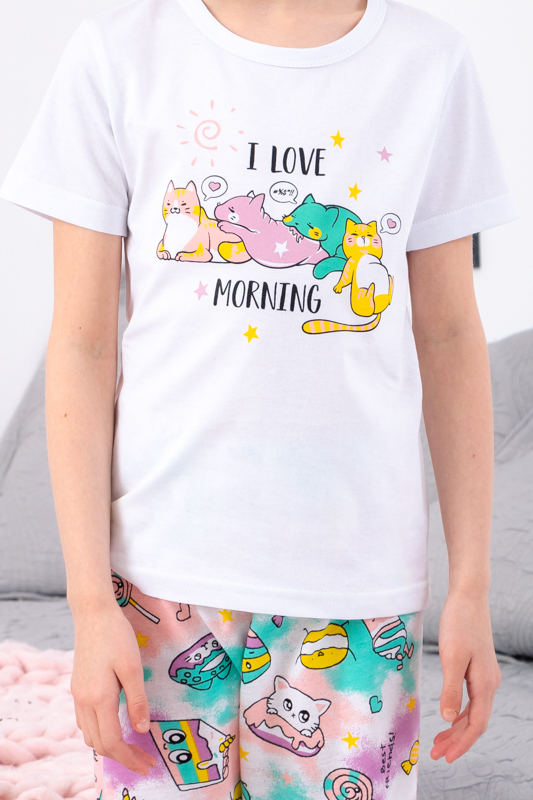 Комплект складається з двох частин: футболки та штанів. Футболка виконана з однотонного куліру та оздоблена яскравим принтом, що додає образу індивідуальності й веселого настрою.