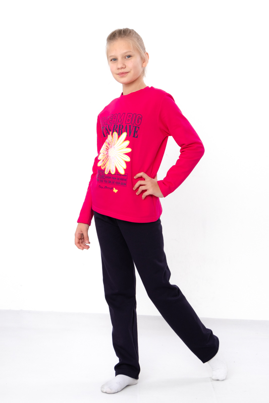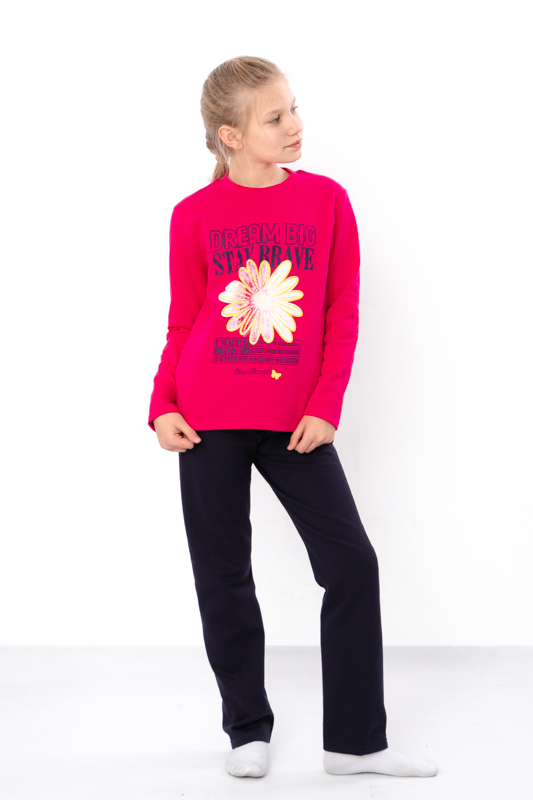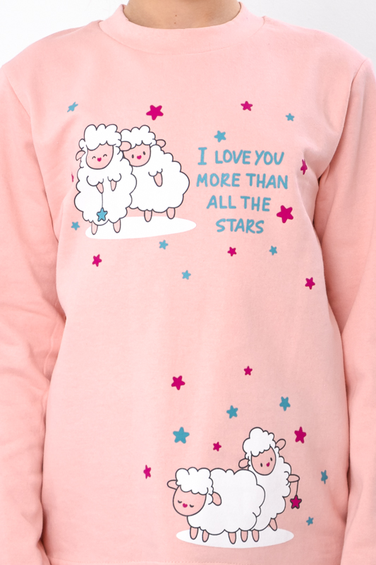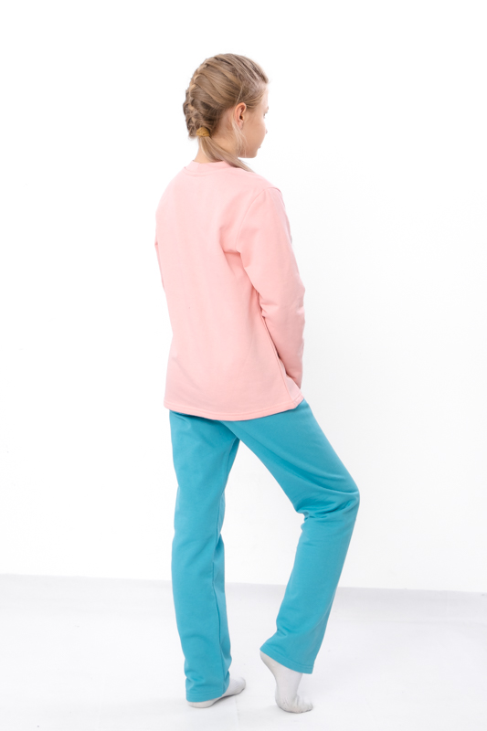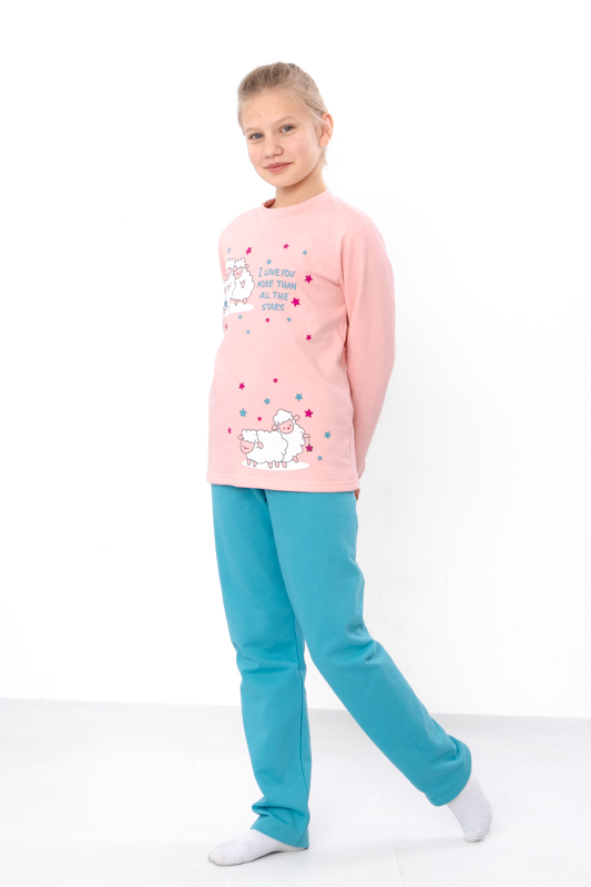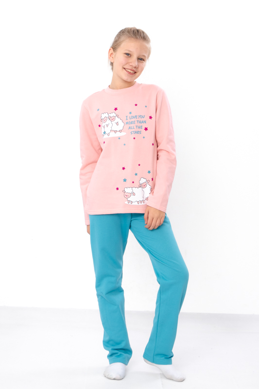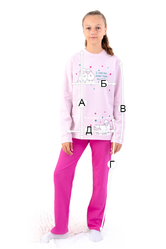 Тепла та комфортна піжама для дівчаток-підлітків, пошита з однотонного начосу. Кофта прямого крою з округлою горловиною. Спереду прикрашена милим накатним малюнком, який обов'язково сподобається дівчатам. Штани прямого крою на резинці. В такій піжамі дитина буде тепло та затишно. Можна носити в якості домашнього одягу. Піжама пошита з трикотажного полотна - начосу. Це трикотажне полотно з футерною ниткою, яка утворює начісування з виворітного боку, завдяки цьому полотно має хороші теплоізолюючі властивості.