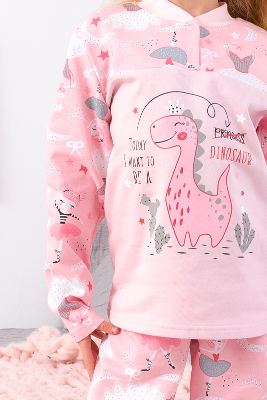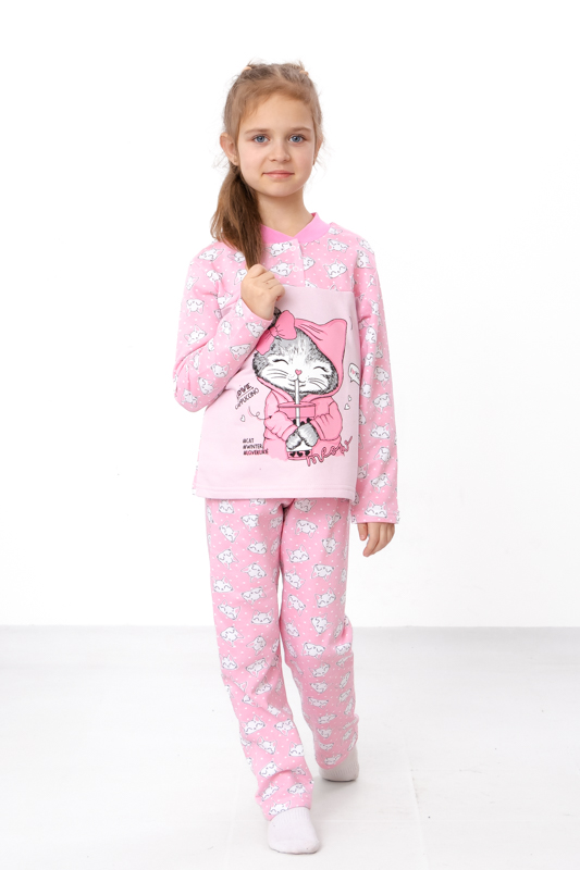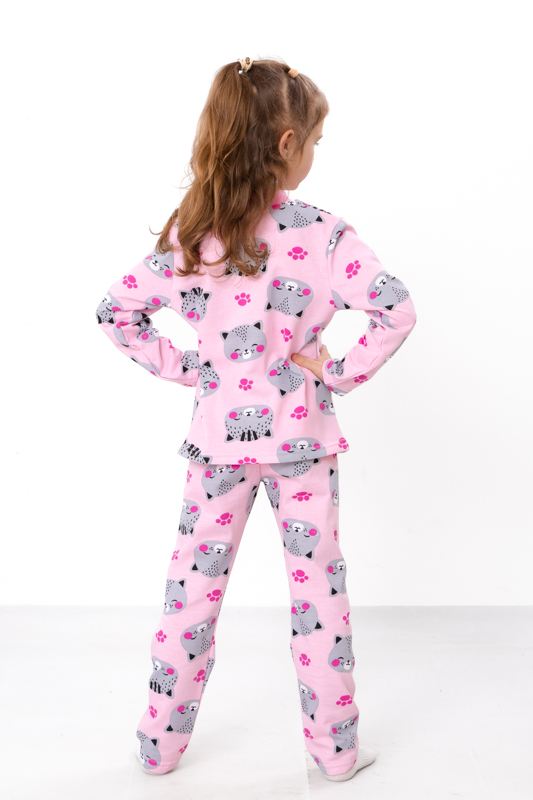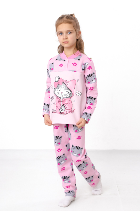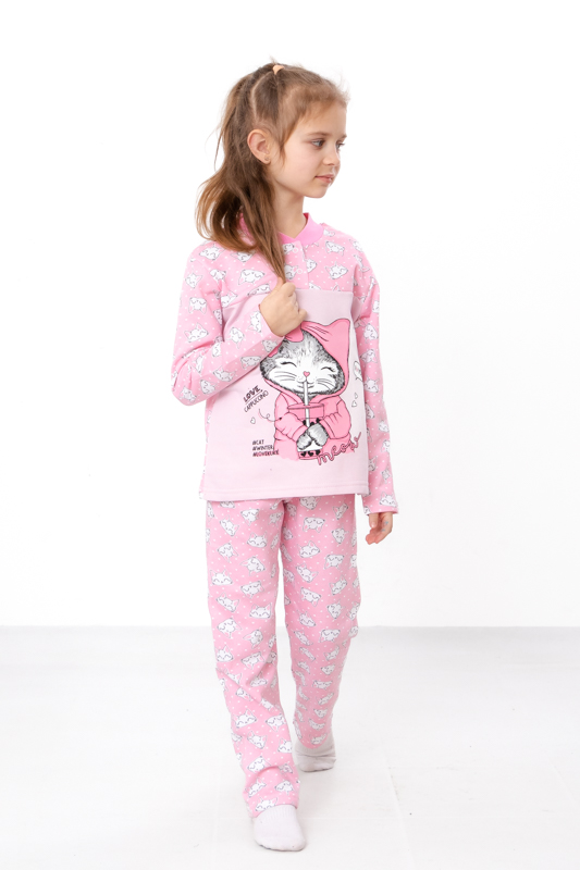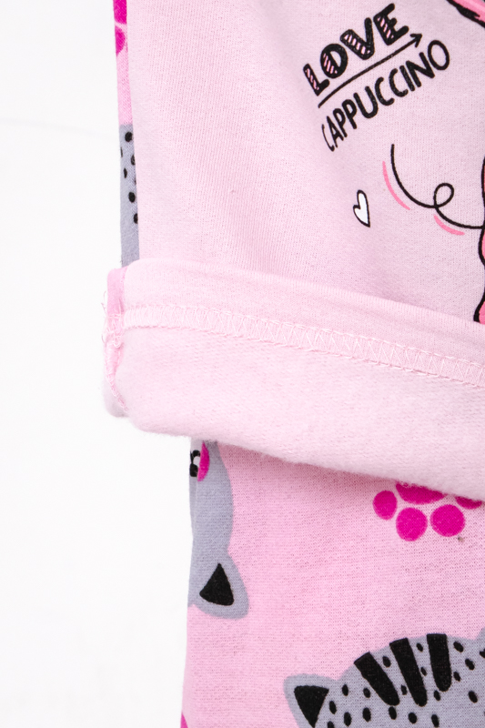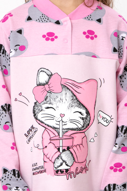 Утеплена піжама для дівчаток з однотонного начосу. Складається з кофти з довгими рукавами та округлою горловиною, горловина застібається на кнопки. Штани вільного крою, прямі, на резинці. Модель виконана в комбінації однотонного та набивного начосу. Спереду на кофті нанесений милий дівчачий малюнок. Піжаму можна використовувати в якості домашнього костюму. Полотно гарної якості, має натуральний склад, тепле та приємне до тіла.