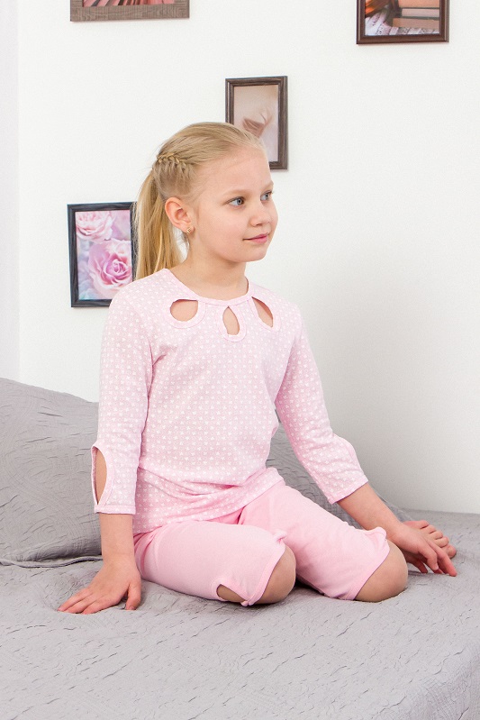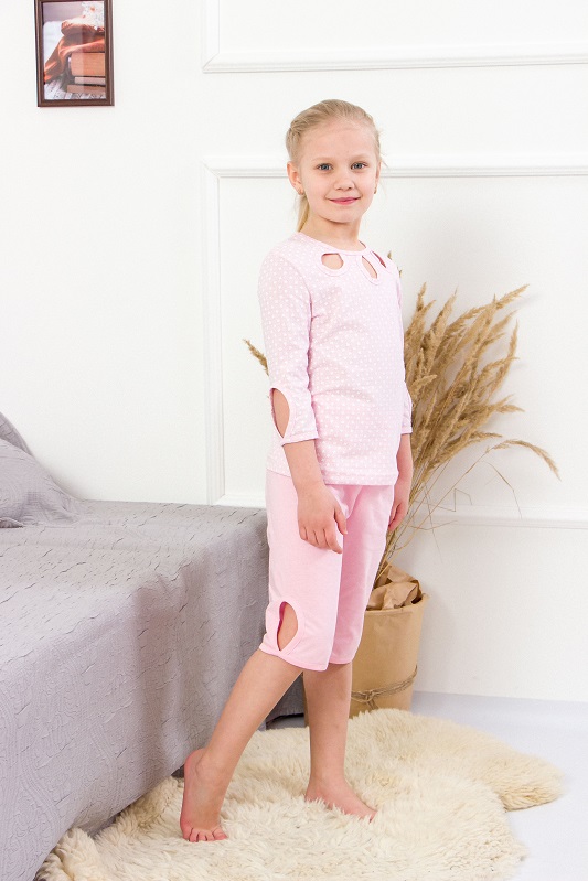 Довжина рукава — три чверті, що дуже зручно для міжсезоння або літніх ночей, коли хочеться легкого, але не зовсім відкритого одягу. Штанці — подовжені шорти, які не обмежують рухів під час сну й одночасно закривають коліна. Особливістю моделі є декоративні фігурні вирізи на рукавах, грудях та штанинах — стильний елемент, що робить цю піжаму оригінальною та сучасною.