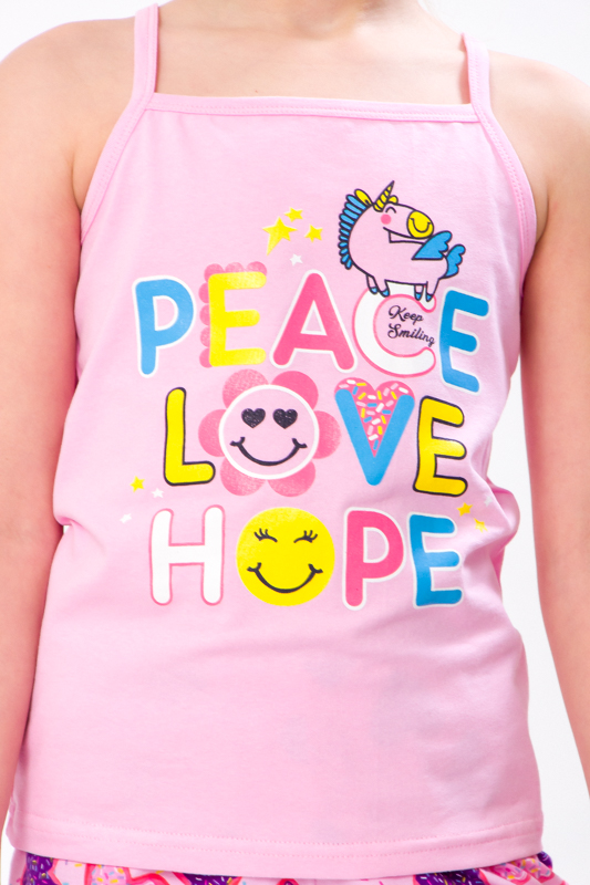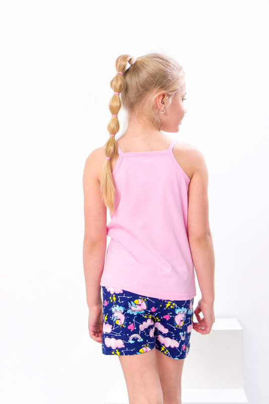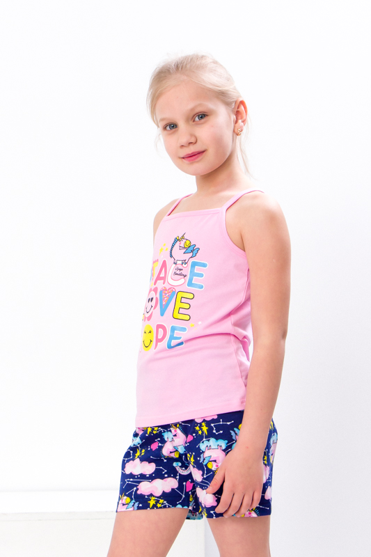 Комплект для дівчинки складається з топу та шортів, пошит з натурального полотна - фулікра. Топ на тонких бретельках, спереду нанесений принт. Шорти на резинці. Полотно відмінної якості, при правильному догляді не дає усадку, завдяки наявності еластану в складі не витягуєтьтся. Такий комплект стане чудовим варіантом в якості літньої піжами або домашнього одягу.