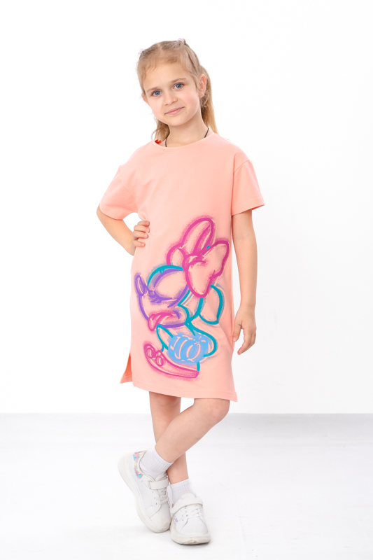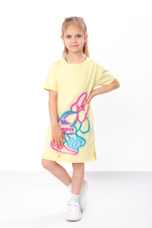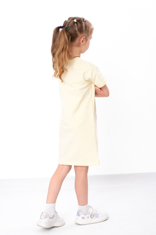 Сукня має довжину до коліна, що робить її зручною як для прогулянок, так і для занять у школі чи відпочинку вдома. Верхня частина оформлена у вигляді футболки — з короткими рукавами та круглою горловиною, що забезпечує свободу рухів і не обмежує дитину в активних іграх. Такий фасон — універсальний варіант, що легко комбінується з різним взуттям та аксесуарами.