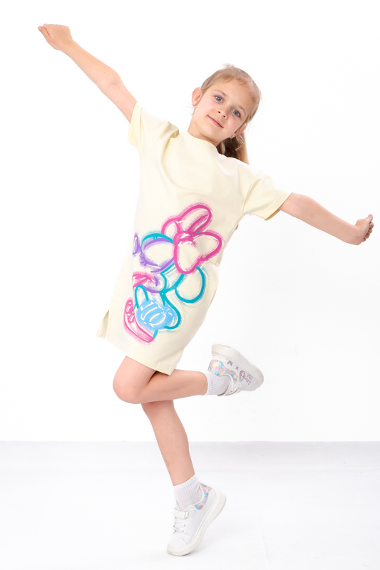 Завдяки однотонному забарвленню тканини основна увага фокусується саме на декоративному елементі — принті, який підкреслює індивідуальність дитини. Сукня чудово виглядає як з кросівками, так і з балетками чи босоніжками. Це універсальна річ, яка стане гарним доповненням до дитячого гардероба.