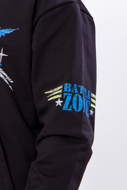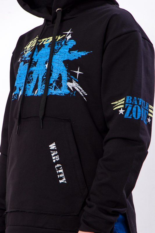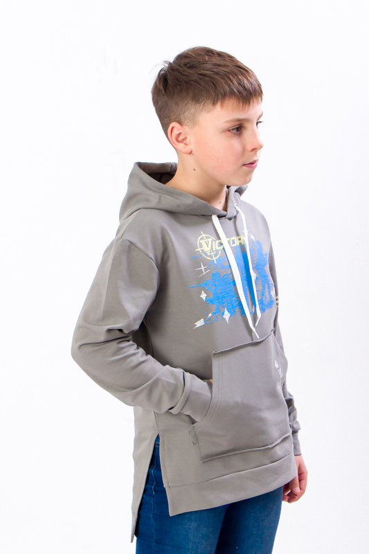 Стильна худі, створена фахівцями відомого українського бренду «Трикотажний Край», призначена для активних підлітків. Завдяки вільному крою рухи не будуть обмежені, забезпечений абсолютний комфорт. Рукава і низ оброблені широкими трикотажними манжетами. Завдяки зручності, яскравого дизайну і незвичайним розрізам виріб відмінно поєднується не тільки зі спортивними штанами, але і з джинсами і чіносами. Капюшон захистить голову від холодного вітру. Зручна і практична толстовка зшита з бавовняного полотна з додаванням волокон поліестеру. Тому м'який і приємний на дотик матеріал володіє важливими перевагами: він відмінно пропускає повітря і відводить вологу, а також відрізняється міцністю, тому добре тримає форму і не розтягується навіть після численних пранів, яскравий принт по переду і на рукавах додасть особливого шику.