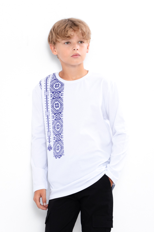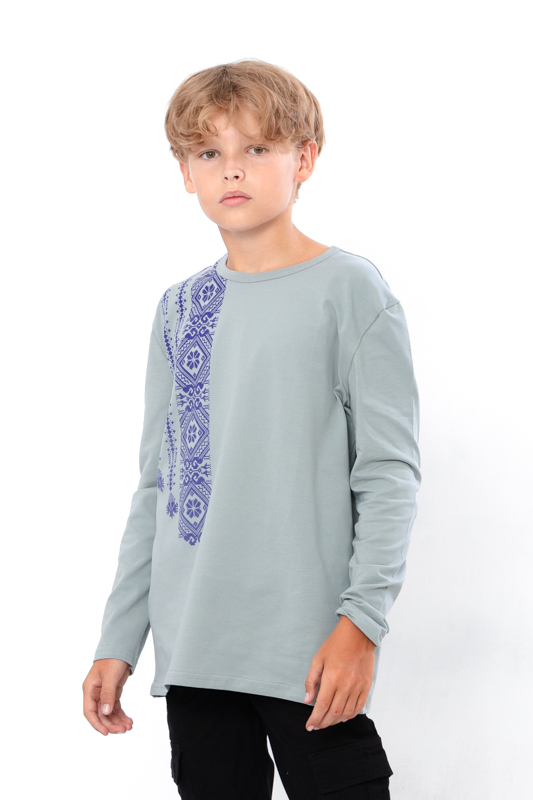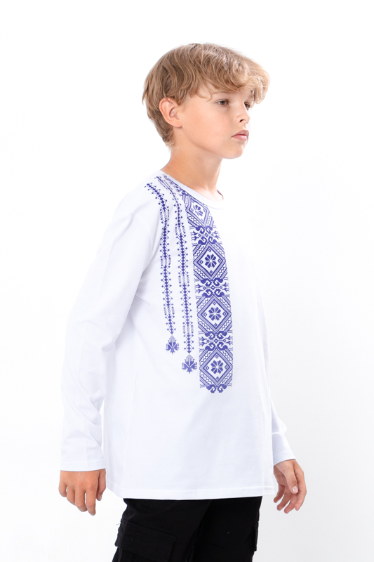 Джемпер для хлопчиків пошитий з еластичного трикотажного полотна - фулікра. Полотно гарної якості, при правильному догляді не дає усадку, не линяє та не скочується . Джемпер має округлу горловину, спереду прикрашений патріотичним принтом у вигляді вишивки. Джемпер чудово підходить для святкових заходів, можна поєднувати з джинсами або брюками.