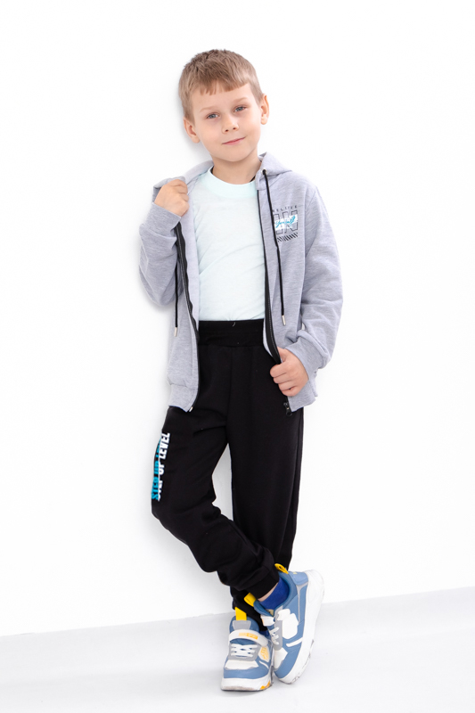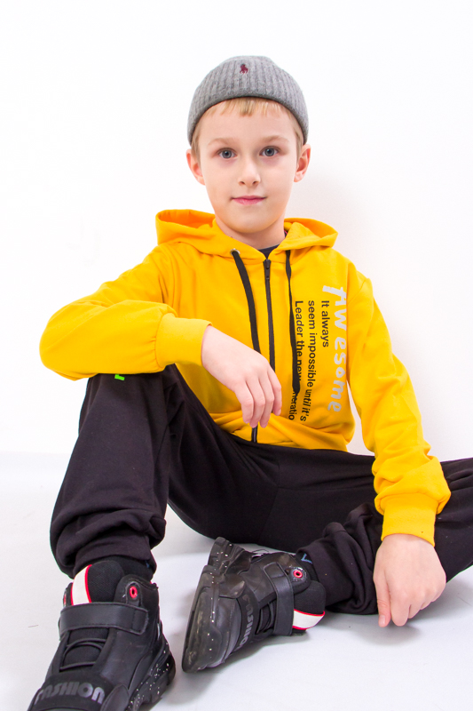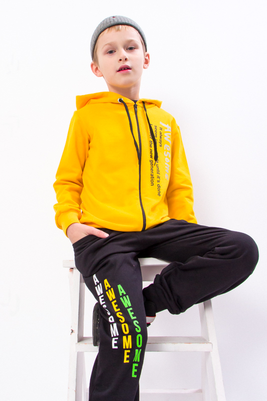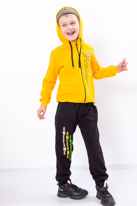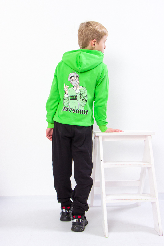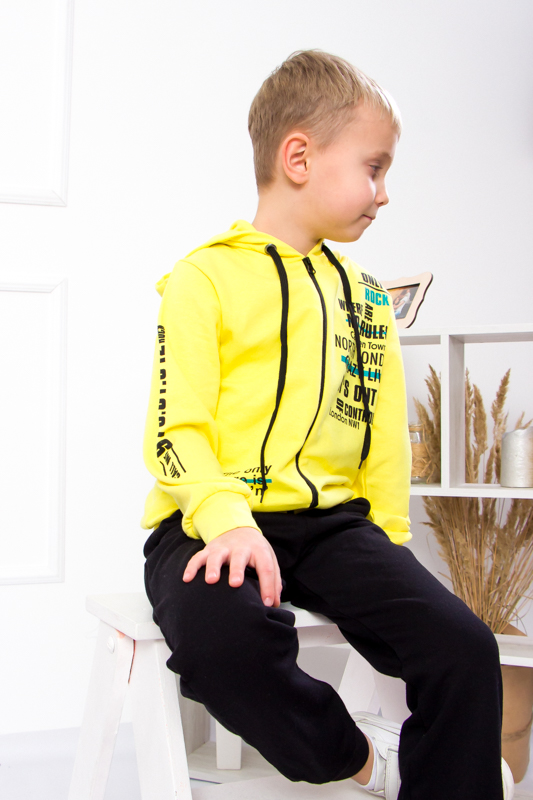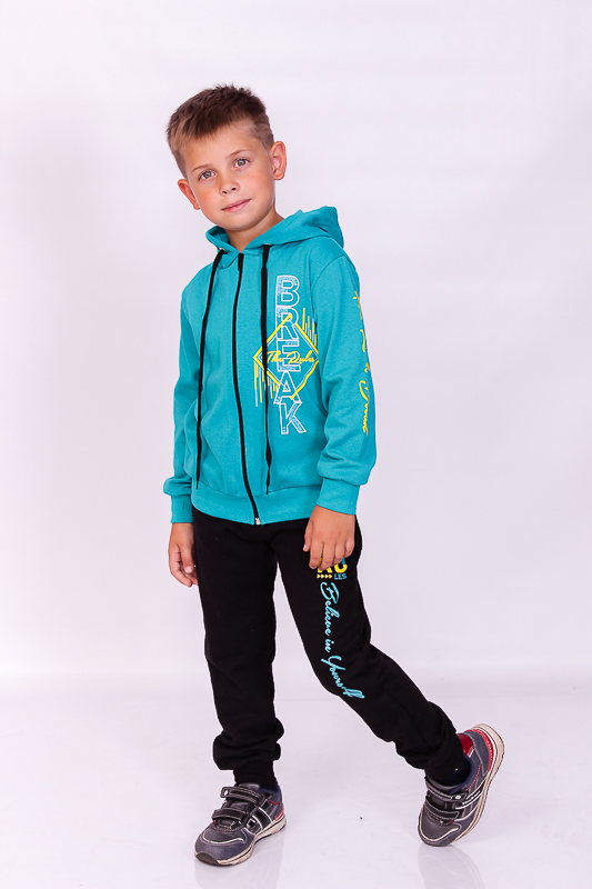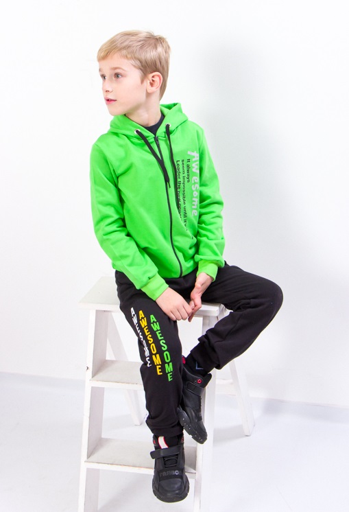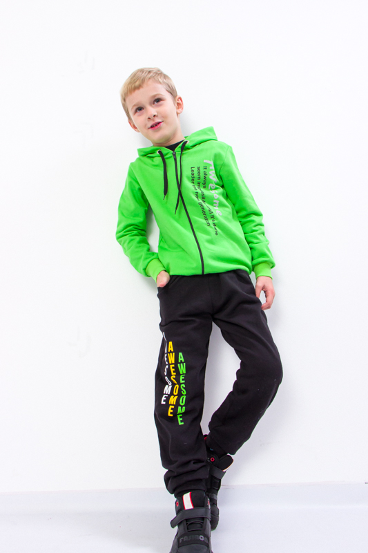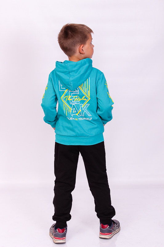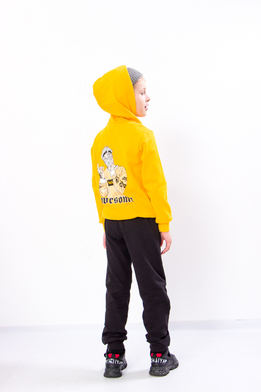 У дитячий спортивний костюм входять: кофта та штани. Модель виконана з однотонного начоса. Полотно сідає при пранні по довжині на 1-2 см. Рекомендується прати при температурі не більше 30 градусів. Кофта з капюшоном, на блискавці, доповнена декоративним шнурком. Штани на резинці, яка добре тягнеться, також, для зручності присутні кишені. На рукавах, знизу кофти і штанів стрейчеві манжети. Костюм прикрашений барвистим і якісним накатом. Модель ідеально підійде для прогулянок, занять спортом.