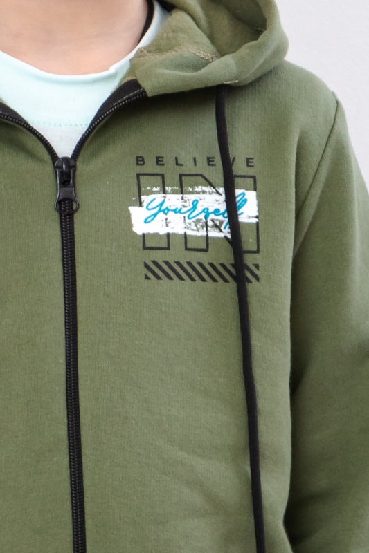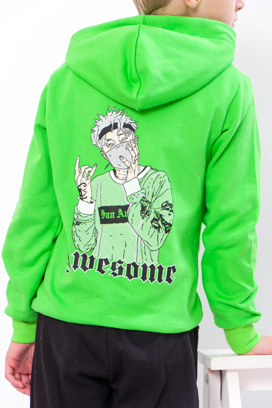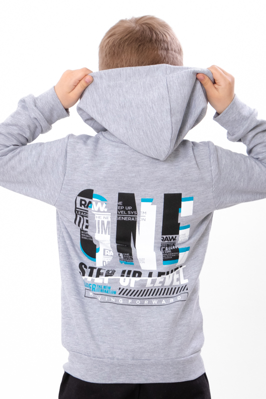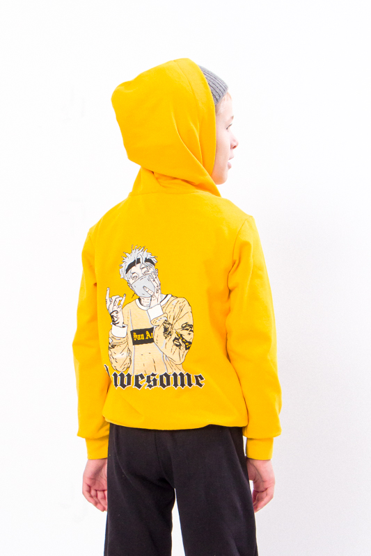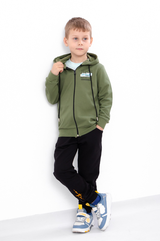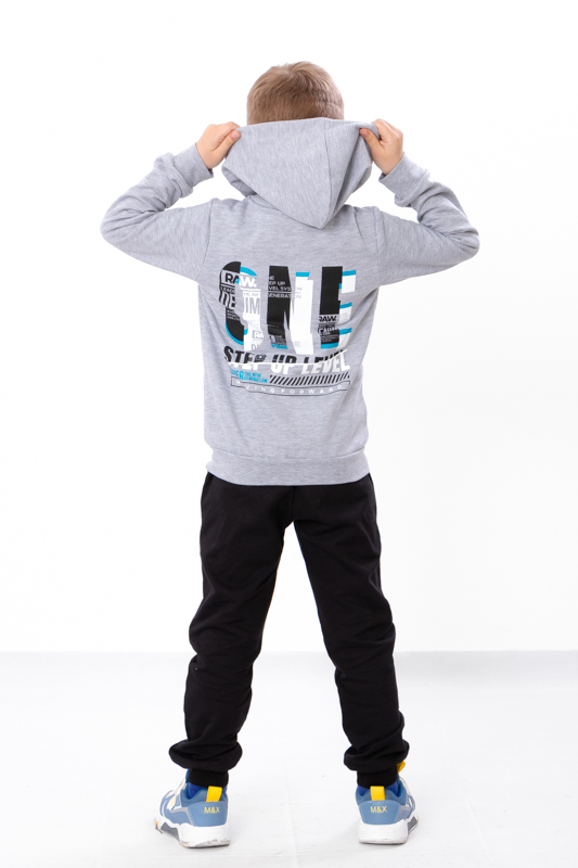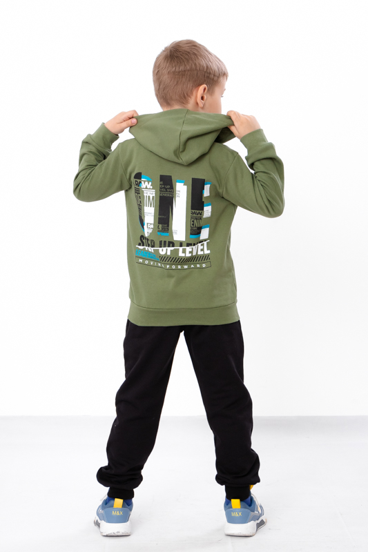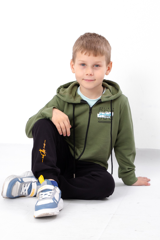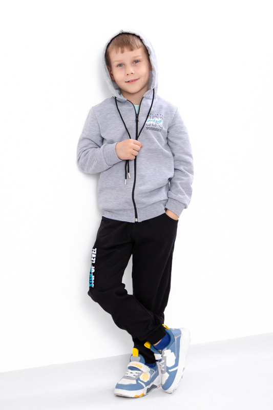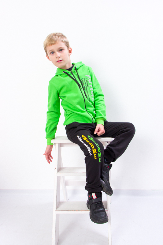 У дитячий спортивний костюм входять: кофта та штани. Модель виконана з однотонного начоса. Полотно сідає при пранні по довжині на 1-2 см. Рекомендується прати при температурі не більше 30 градусів. Кофта з капюшоном, на блискавці, доповнена декоративним шнурком. Штани на резинці, яка добре тягнеться, також, для зручності присутні кишені. На рукавах, знизу кофти і штанів стрейчеві манжети. Костюм прикрашений барвистим і якісним накатом. Модель ідеально підійде для прогулянок, занять спортом.