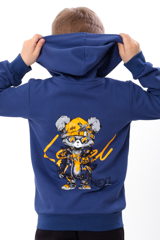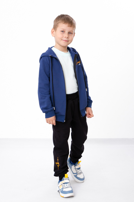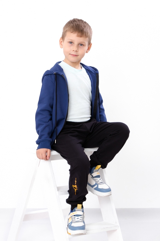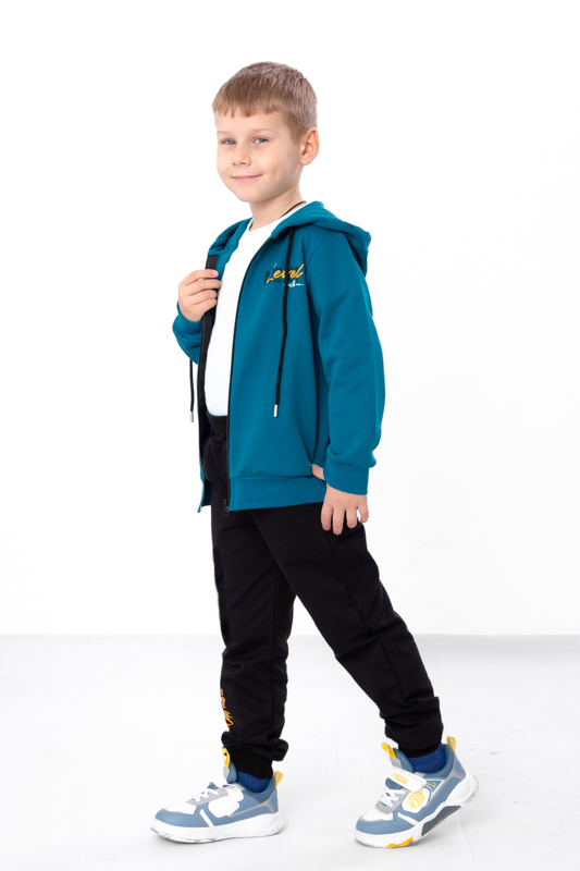 У дитячий спортивний костюм входять: кофта та штани. Модель виконана з однотонного начоса. Полотно сідає при пранні по довжині на 1-2 см. Рекомендується прати при температурі не більше 30 градусів. Кофта з капюшоном, на блискавці, доповнена декоративним шнурком. Штани на резинці, яка добре тягнеться, також, для зручності присутні кишені. На рукавах, знизу кофти і штанів стрейчеві манжети. Костюм прикрашений барвистим і якісним накатом. Модель ідеально підійде для прогулянок, занять спортом.