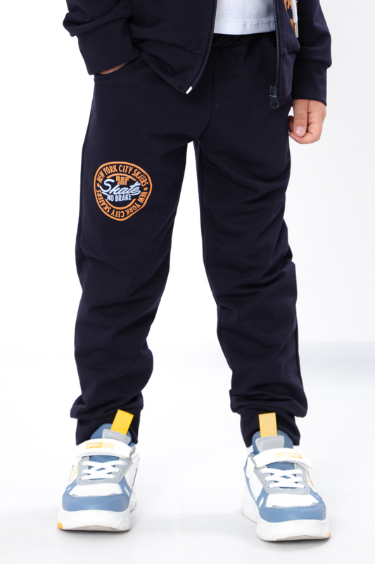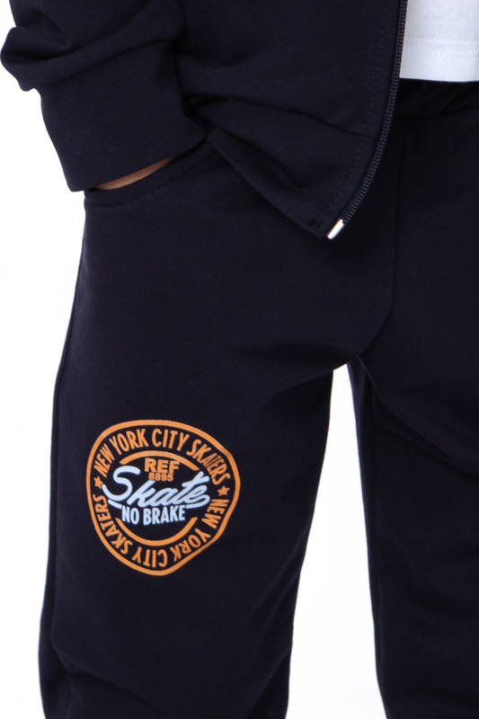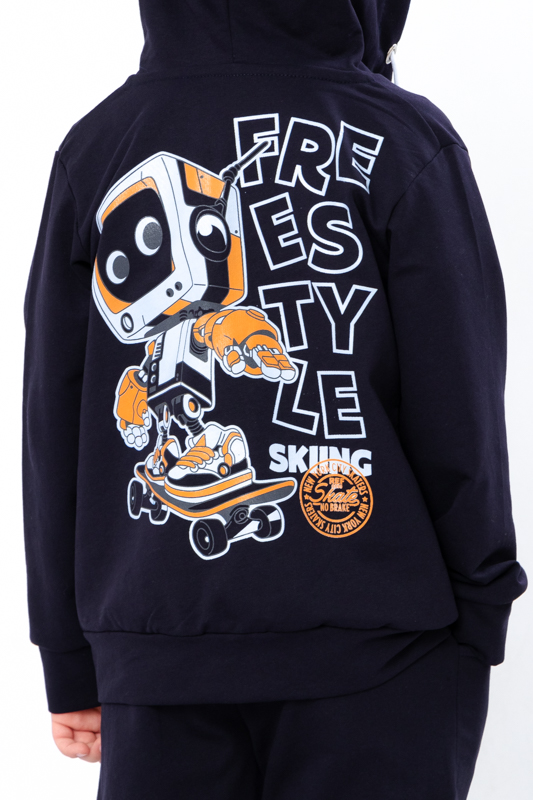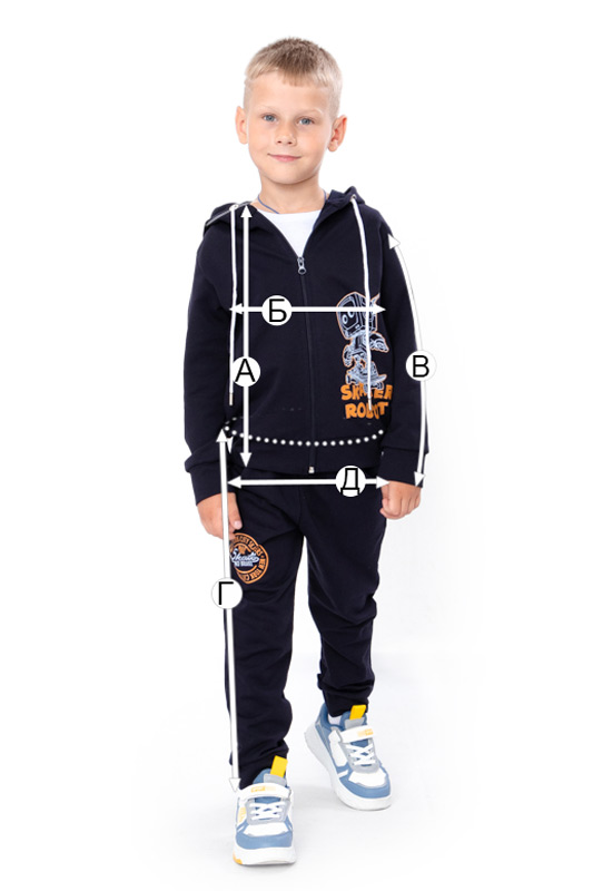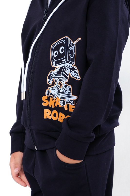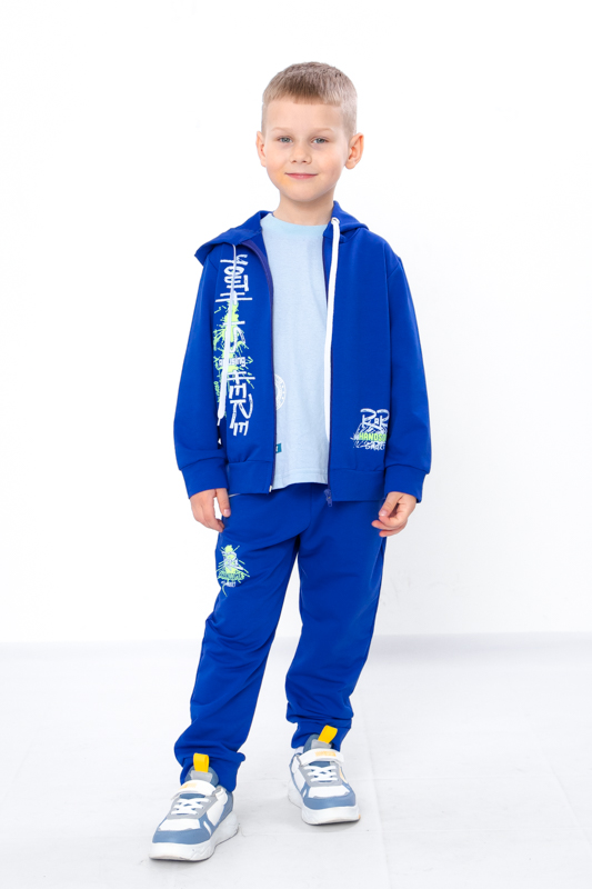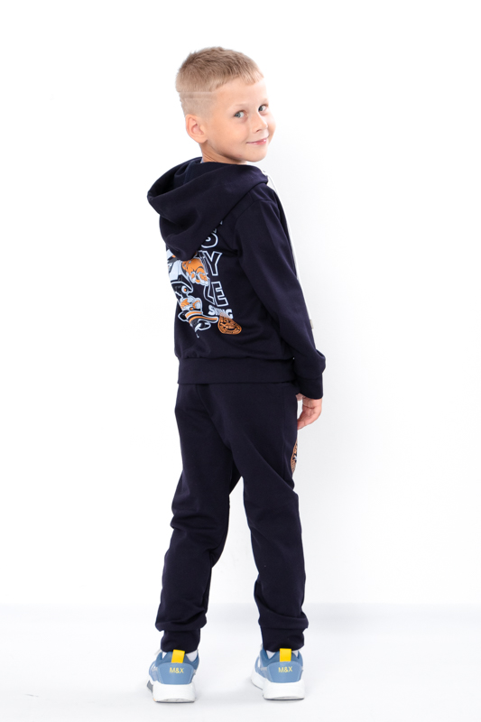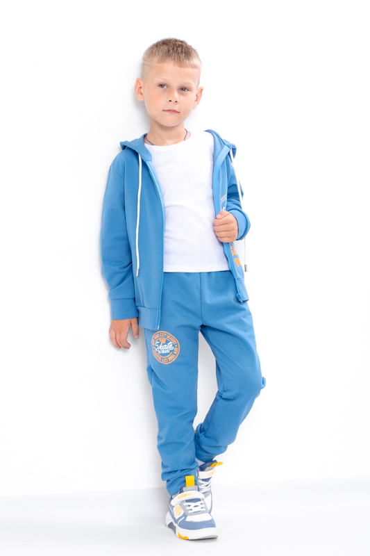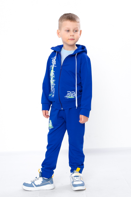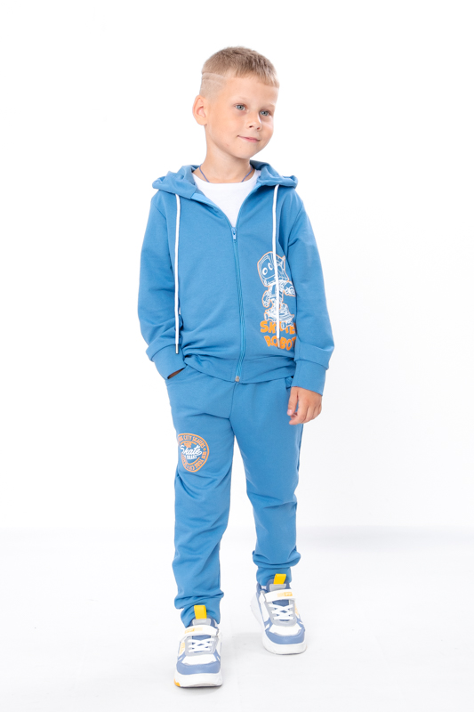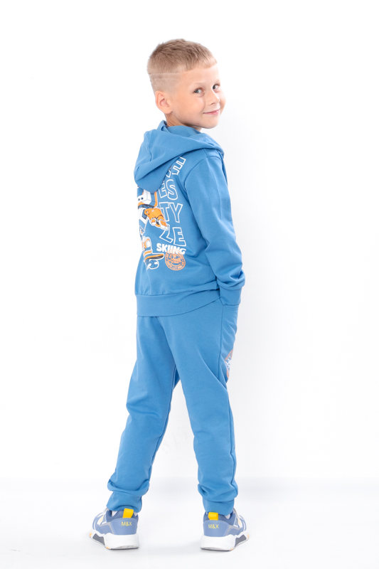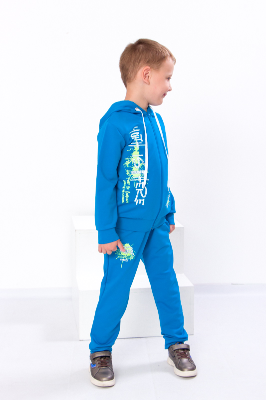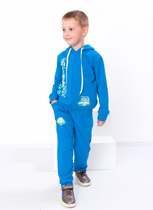 Костюм для хлопчиків складається з джемпера та штанів. Джемпер вільного прямого крою, з капюшоном, довгими рукавами на манжетах, по низу також манжет. Застібається на блискавку. Спереду та на спині є яскравий хлопчачий малюнок, нанесений методом шовкотрафаретного друку. Штани з кишенями, внизу на манжетах, пояс на широкій резинці. Штани також прикрашені малюнком. Костюм підходить для прогулянок, занять спортом, активного відпочинку. Пошит з однотонного полотна – двонитка. Полотно гарної якості. Тому, при правильному догляді, костюм можна буде носити не один сезон. Може давати усадку після прання.