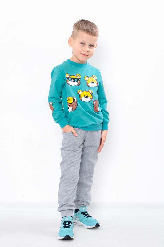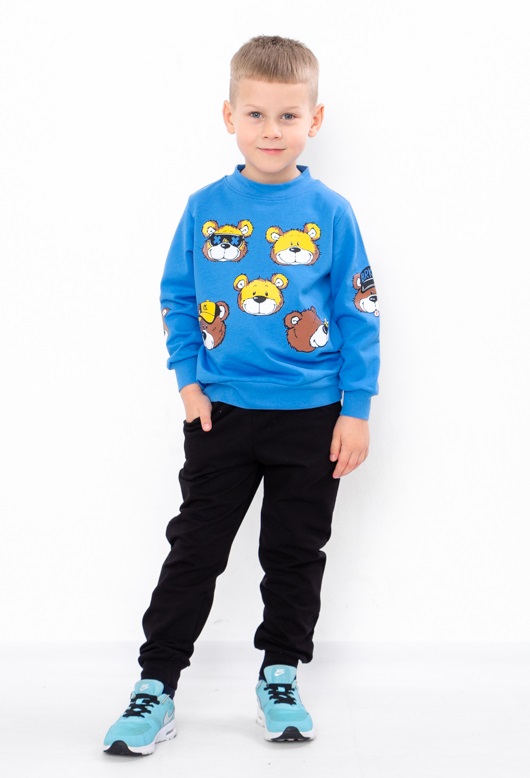Костюм для хлопчика з двонитки, складається з джемперу та штанів. Джемпер з довгими рукавами та округлою горловиною, на рукавах та по низу джемпера широкі еластичні манжети. Прикрашений веселим накатним малюнком. Штани на резинці з манжетами, по бокам є кишені. Такий костюм чудово підійде для повсякденного носіння. Полотно гарної якості. Тому, при правильному догляді, штани можна буде носити не один сезон. Може давати усадку після прання.