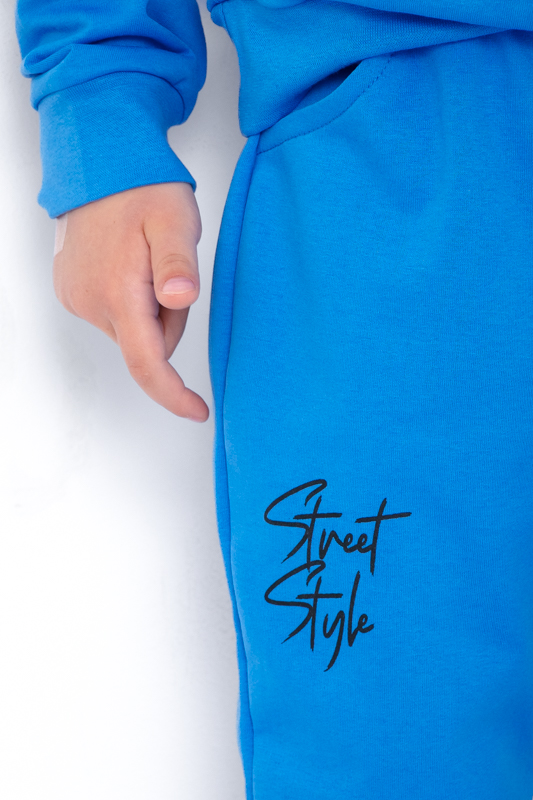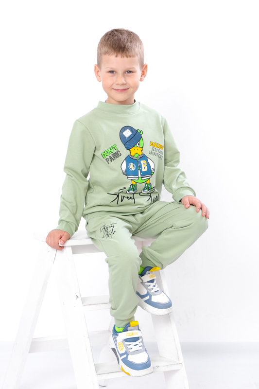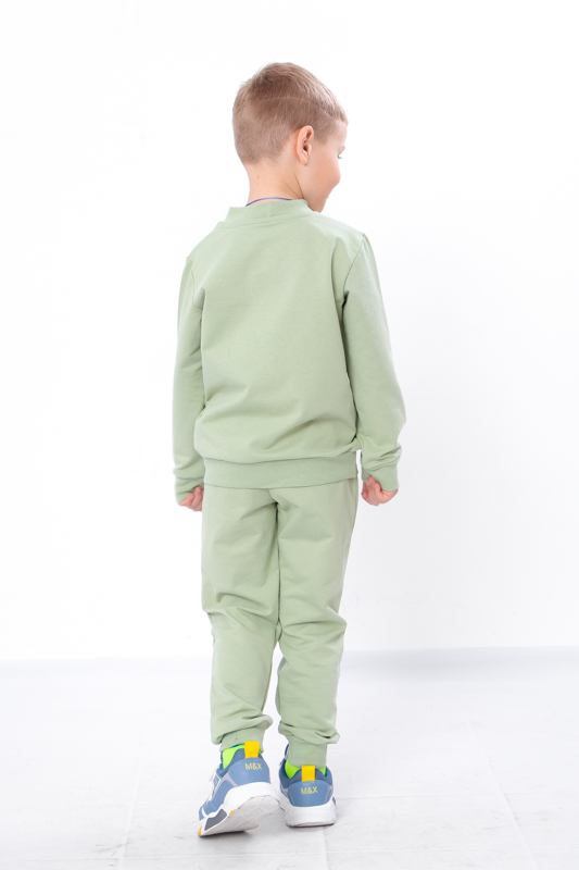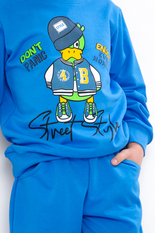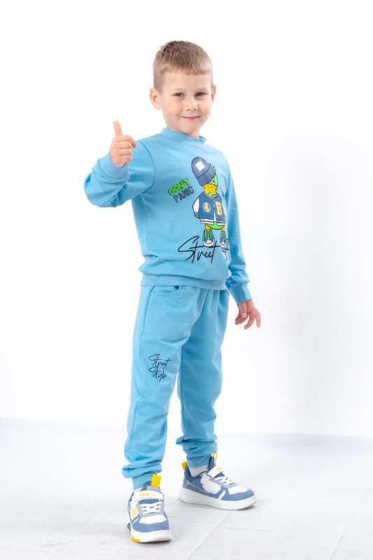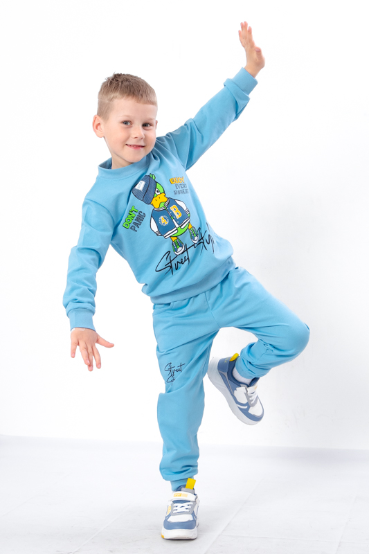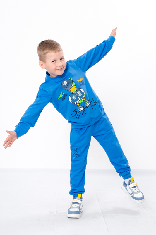 Костюм для хлопчиків складається з джемпера та штанів. Джемпер вільного крою з округлою горловиною. Штани з кишенями, внизу на манжетах, пояс на широкій зручній резинці. Костюм прикрашений яскравим накатом, який обов'язково сподобається хлопчикам. Костюм підходить для прогулянок, занять спортом, активного відпочинку. Пошит з однотонного полотна – двонитка. Полотно гарної якості. Тому, при правильному догляді, костюм можна буде носити не один сезон. Може давати усадку після прання.