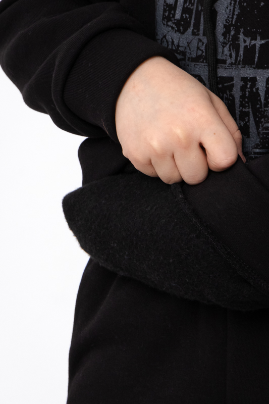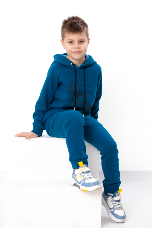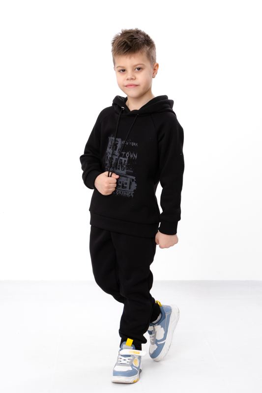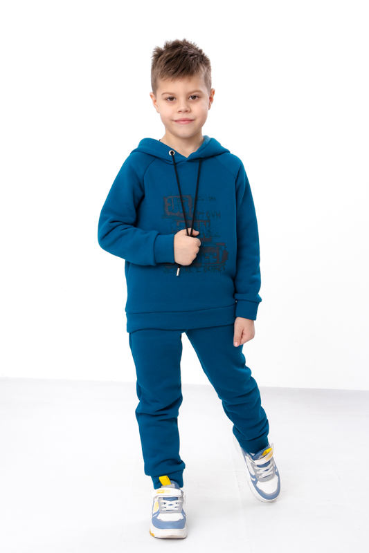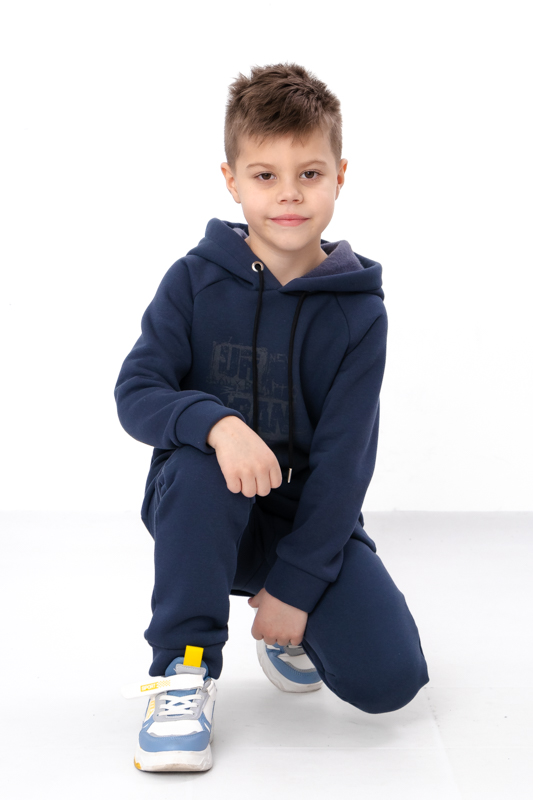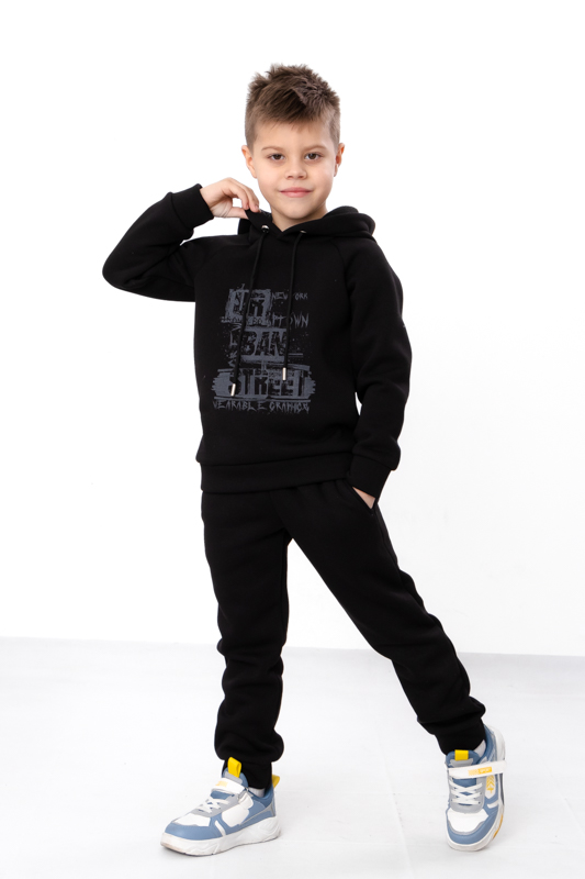 Цей стильний костюм для хлопчика стане улюбленим елементом його гардеробу. Кофта з капюшоном, прикрашена принтом на грудях та одному рукаві, що надає костюму модного вигляду. Штани мають зручні кишені та регулюються шнурками на поясі, забезпечуючи ідеальну посадку та комфорт під час руху. Виготовлений з м'якої та якісної тканини - трьохнитка (80% бавовна, 20% поліестер), цей костюм підходить для активного відпочинку та повсякденного носіння.